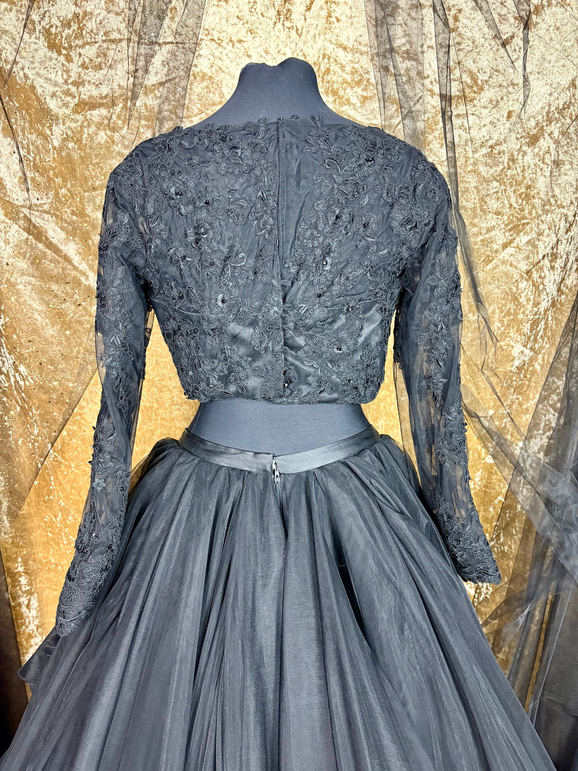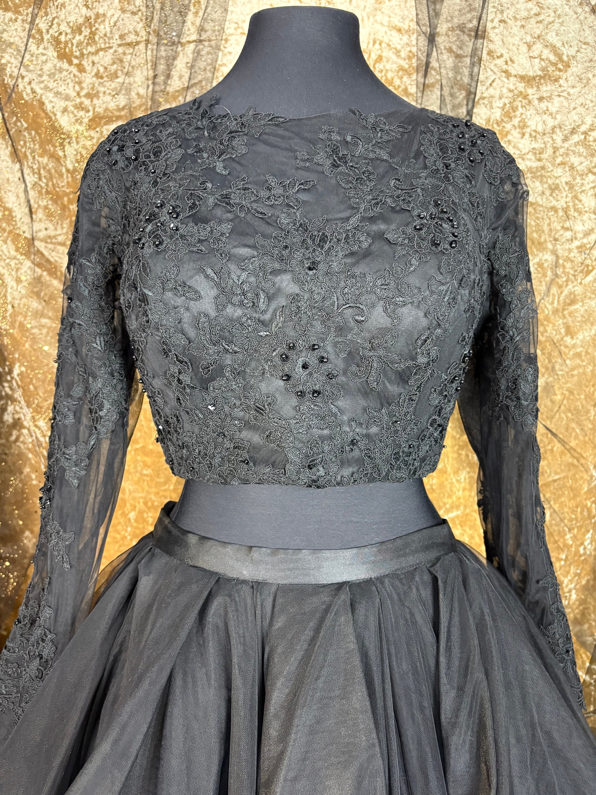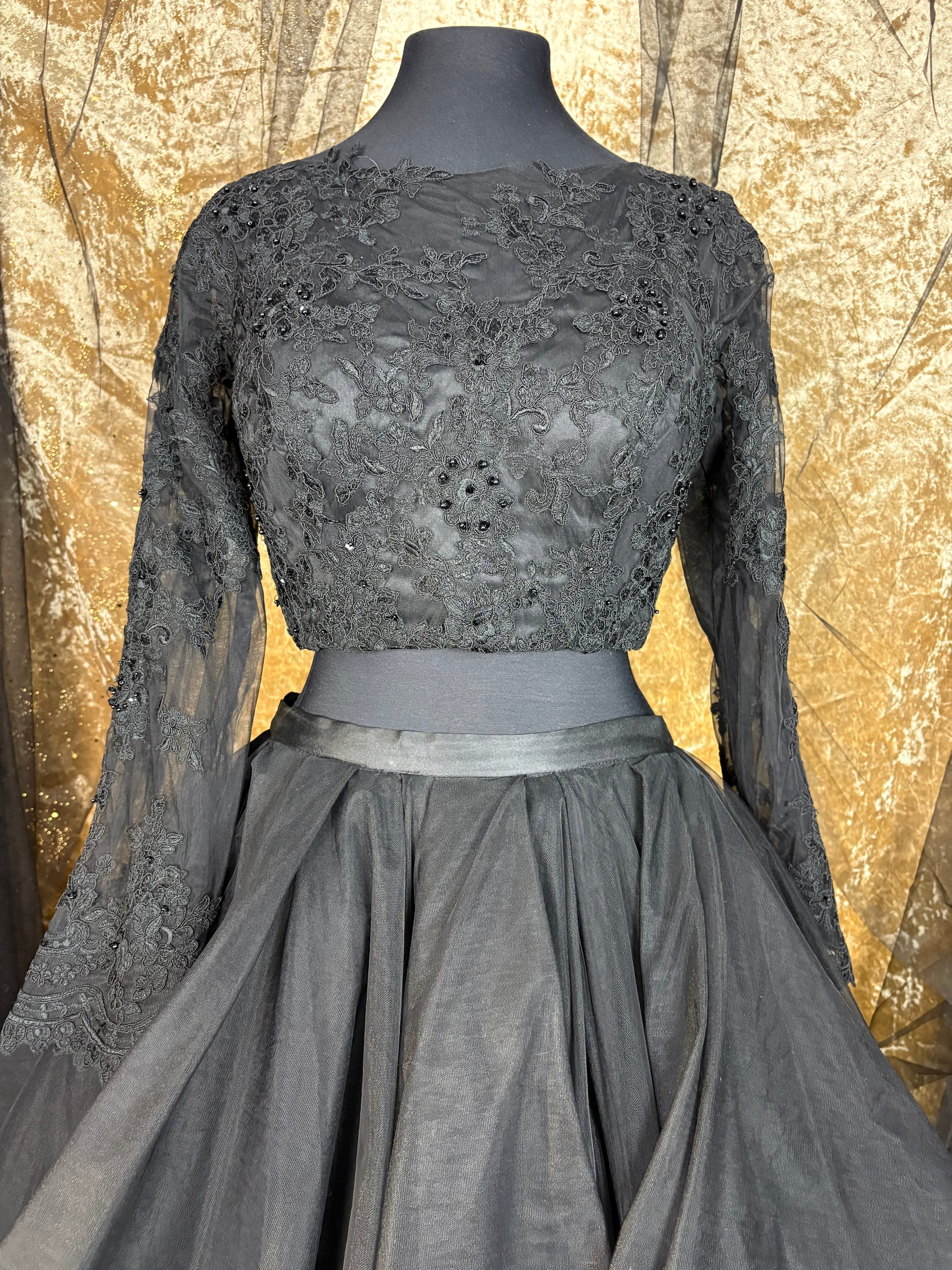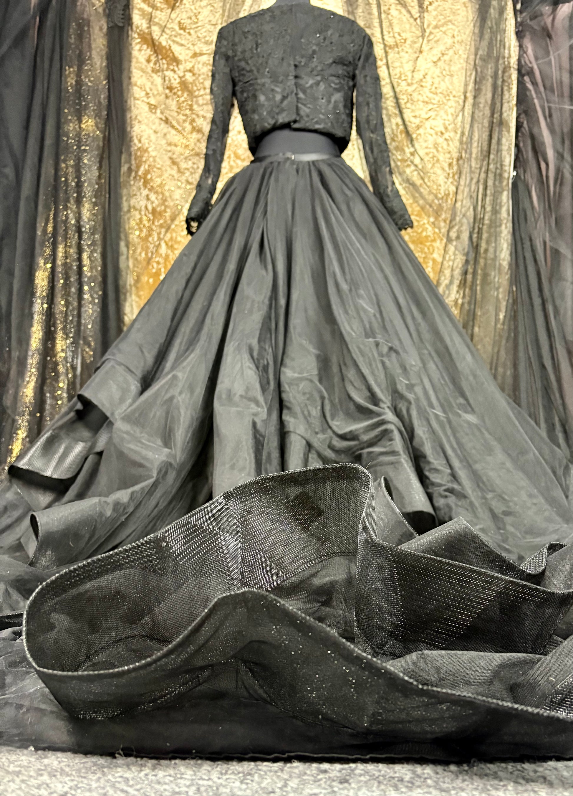 Crafted in midnight layers of billowing tulle, the skirt cascades in sculpted waves — every fold a whisper of rebellion and grace. The cropped lace bodice, sheer and intricate, reveals a daring glimpse of skin, celebrating confidence and individuality in perfect equilibrium. Together, they form a silhouette that commands attention and refuses convention.