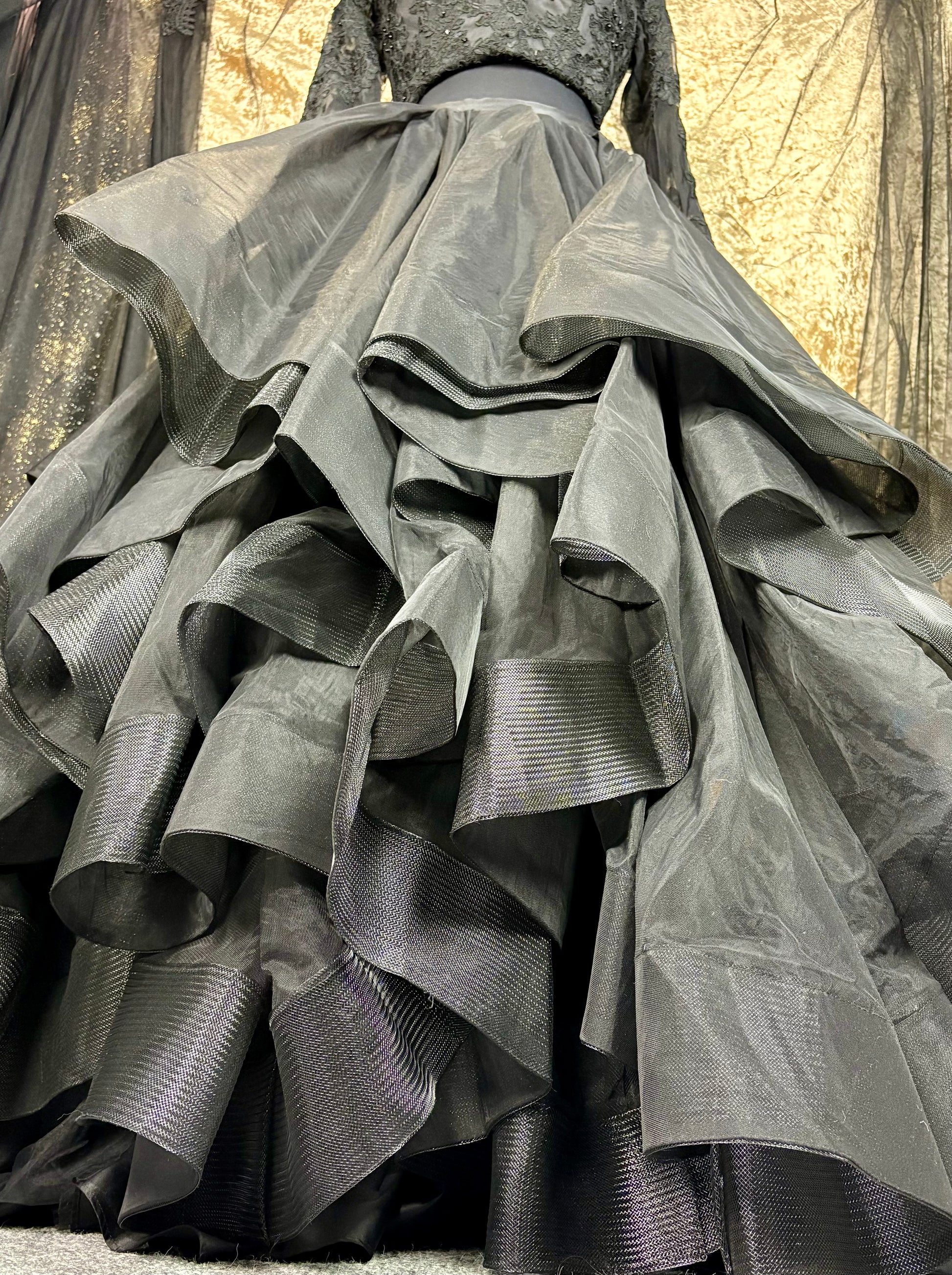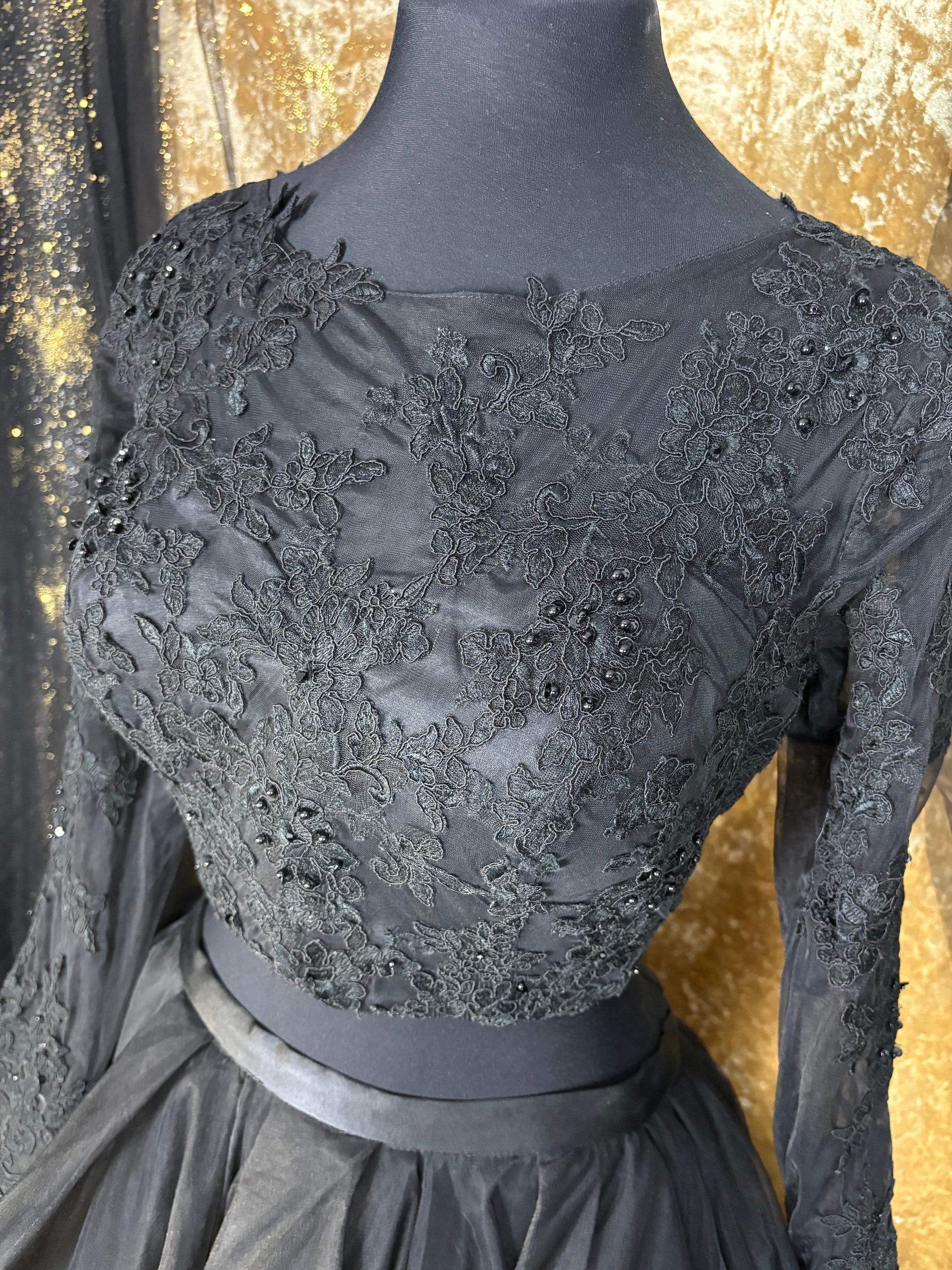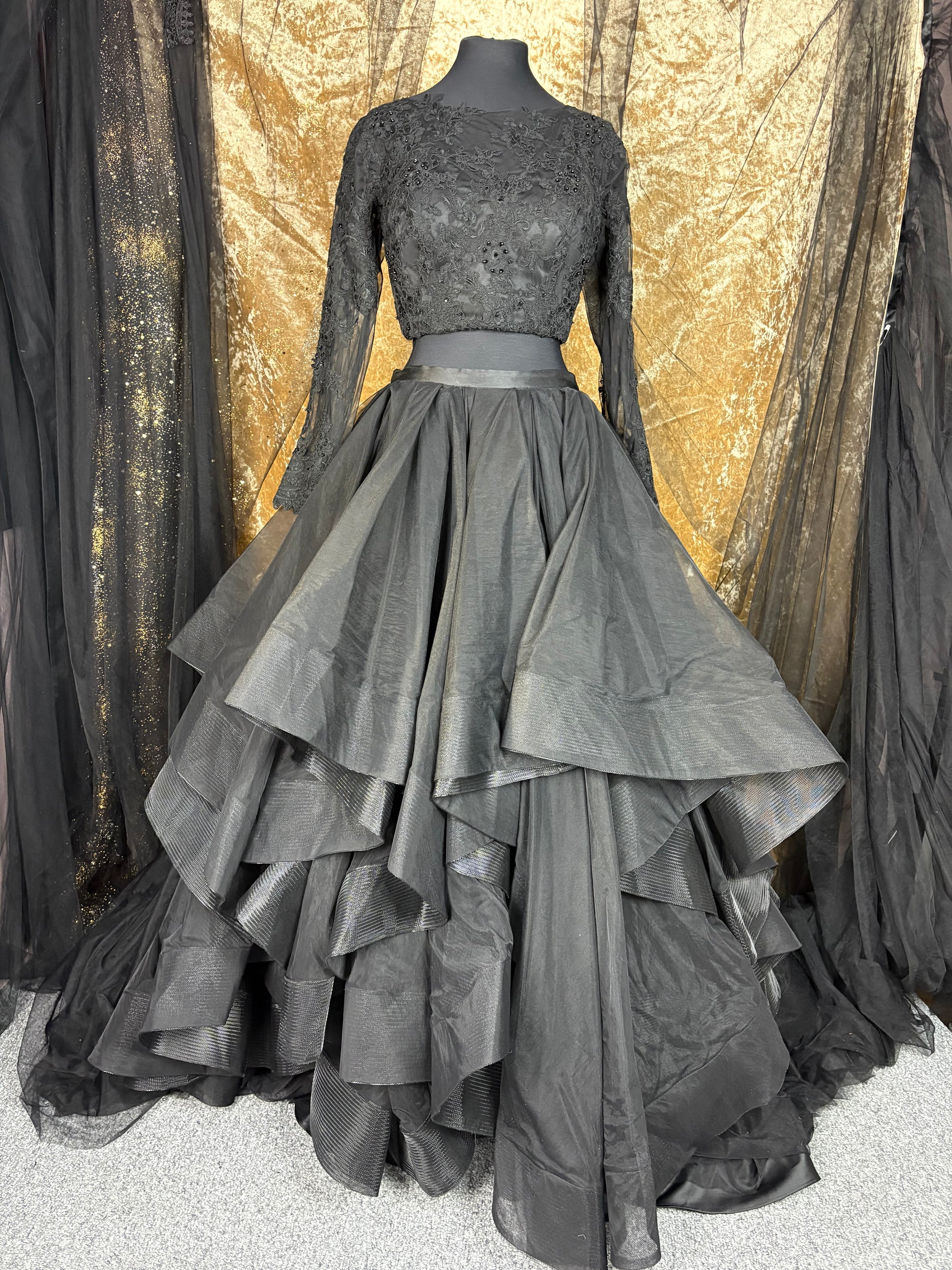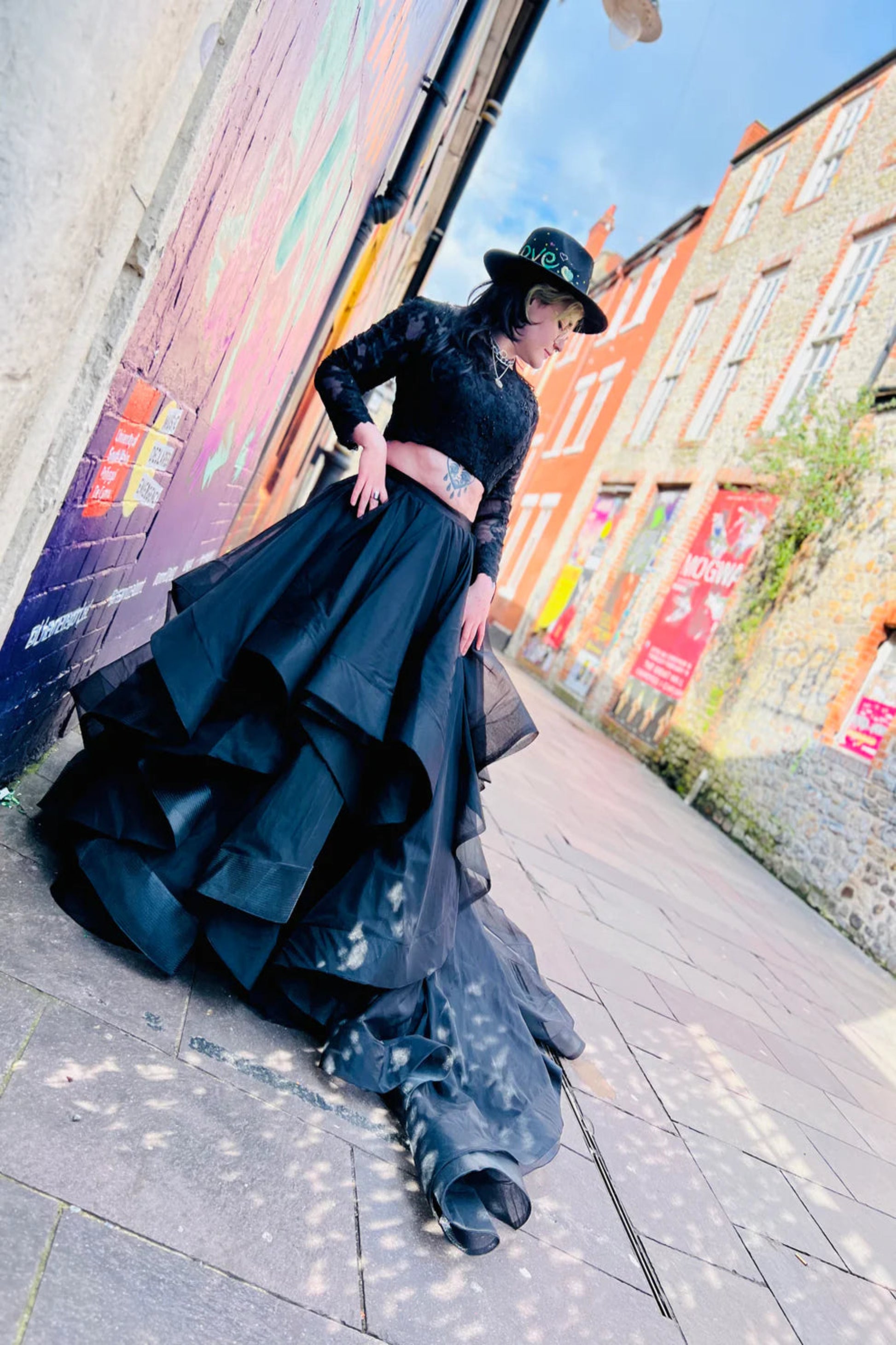 Crafted in midnight layers of billowing tulle, the skirt cascades in sculpted waves — every fold a whisper of rebellion and grace. The cropped lace bodice, sheer and intricate, reveals a daring glimpse of skin, celebrating confidence and individuality in perfect equilibrium. Together, they form a silhouette that commands attention and refuses convention.