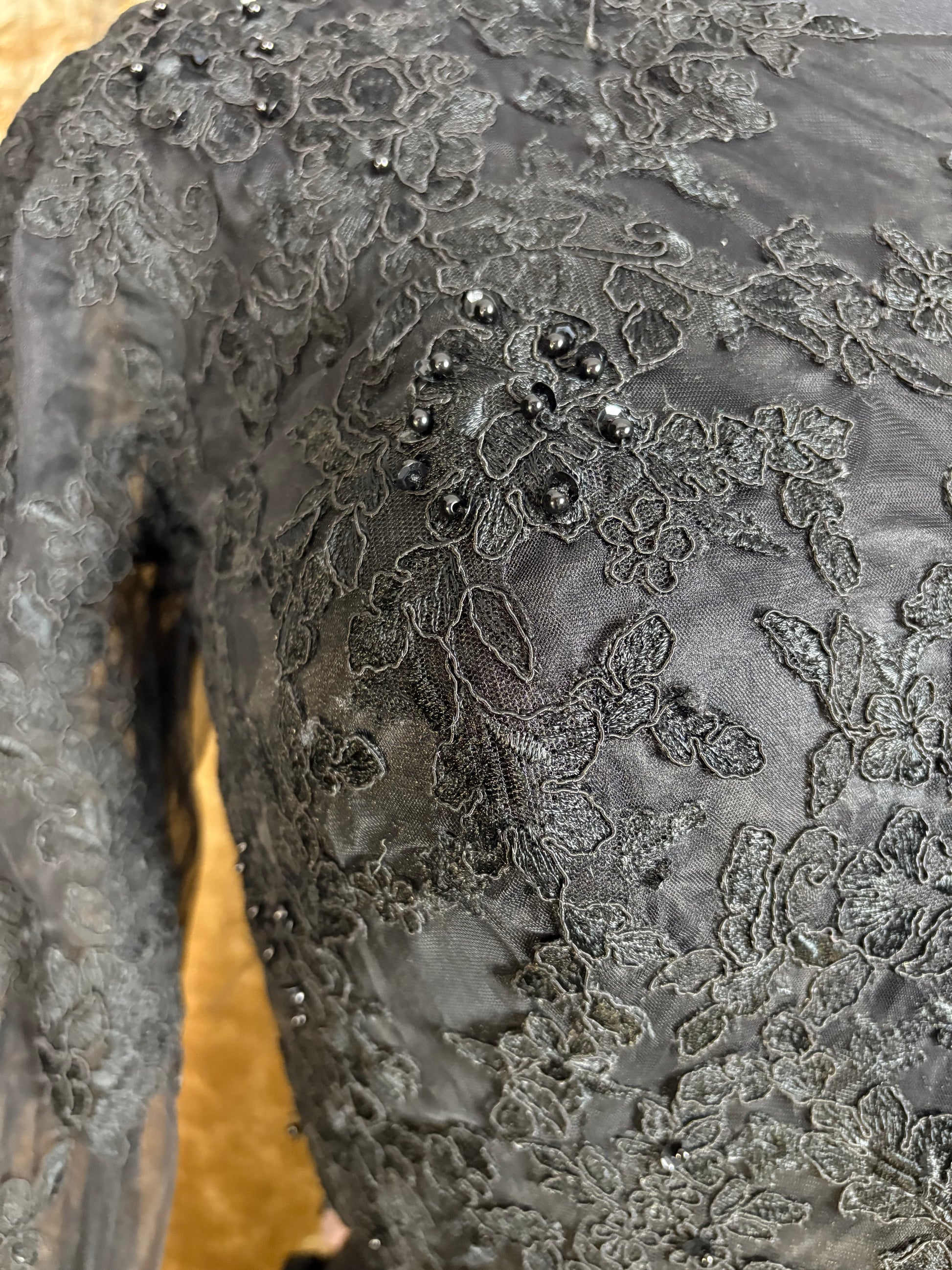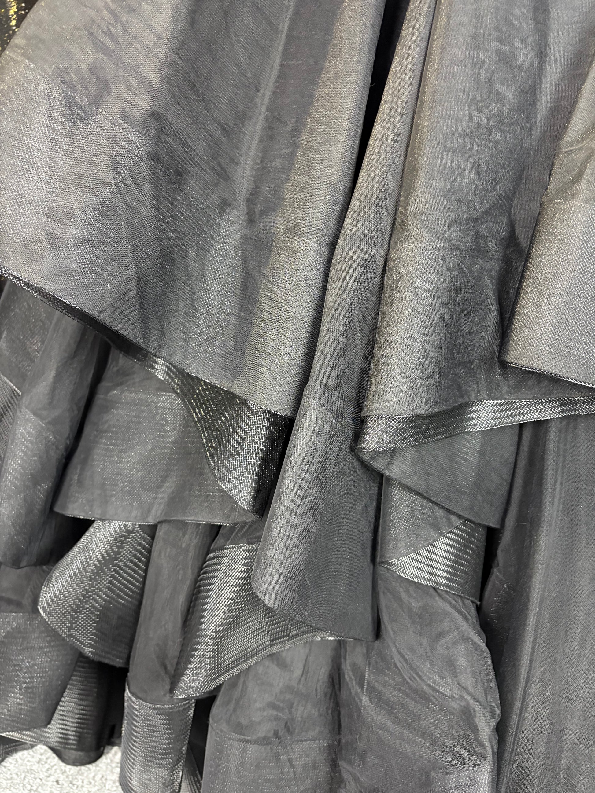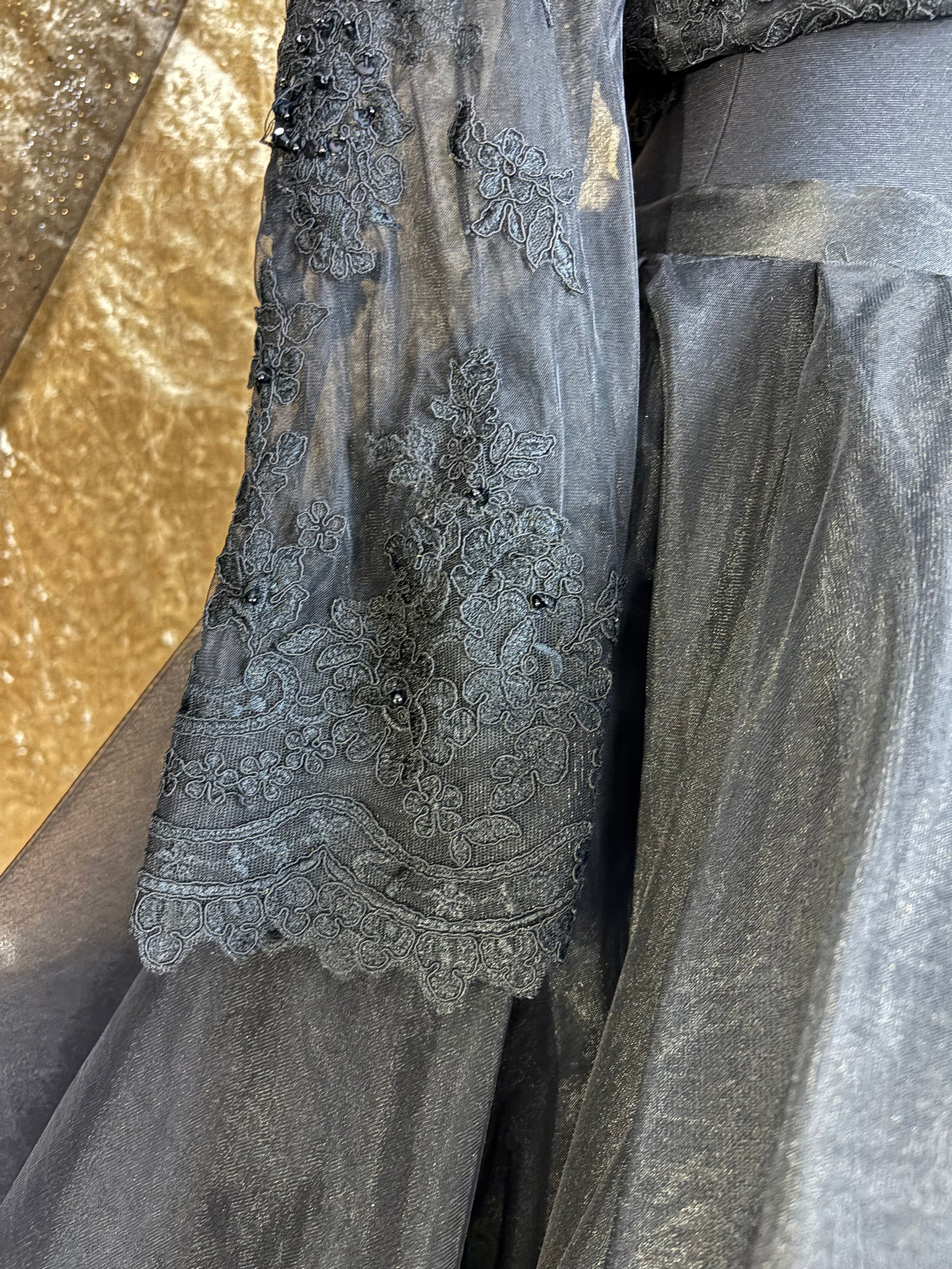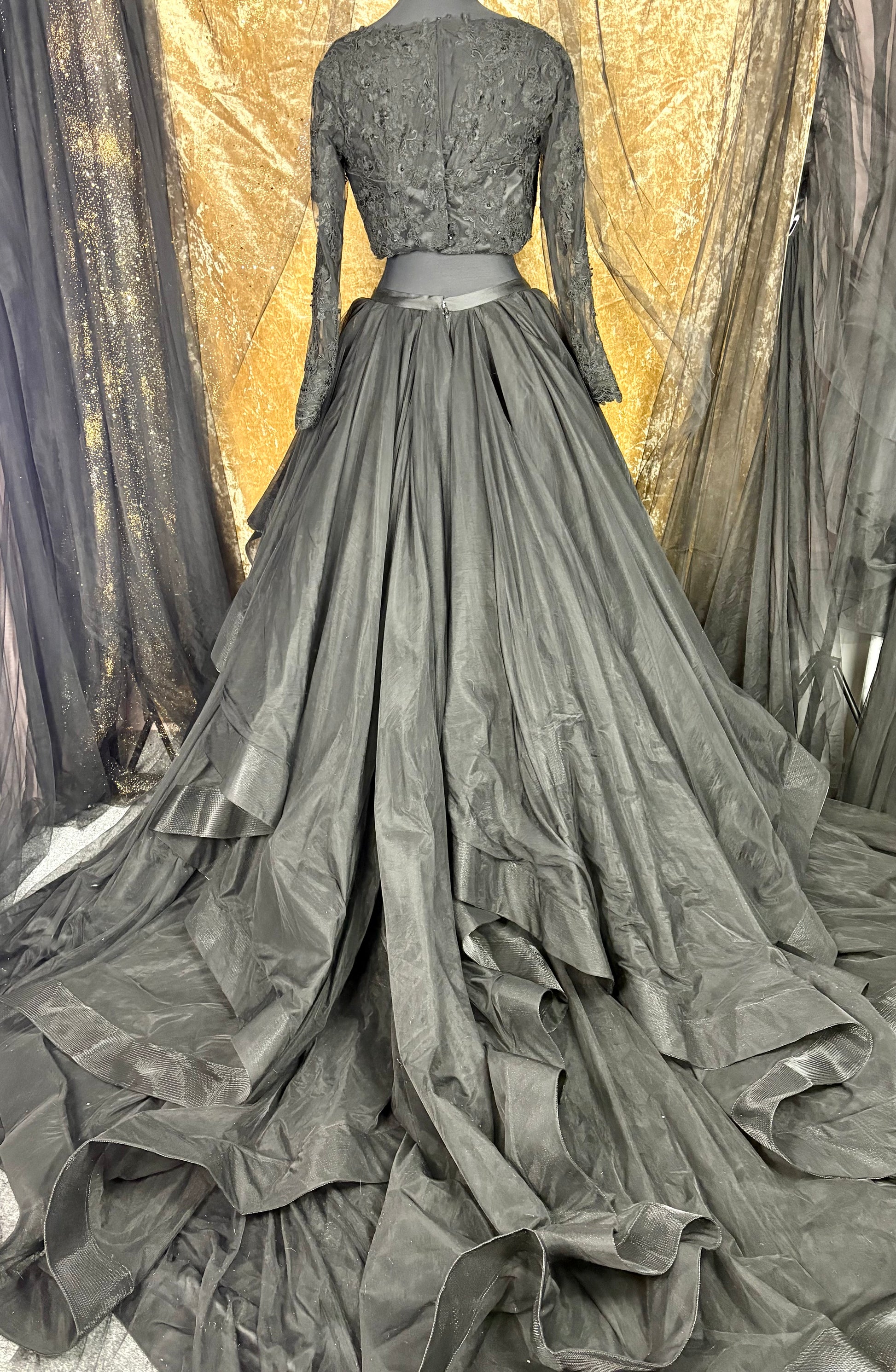 Crafted in midnight layers of billowing tulle, the skirt cascades in sculpted waves — every fold a whisper of rebellion and grace. The cropped lace bodice, sheer and intricate, reveals a daring glimpse of skin, celebrating confidence and individuality in perfect equilibrium. Together, they form a silhouette that commands attention and refuses convention.