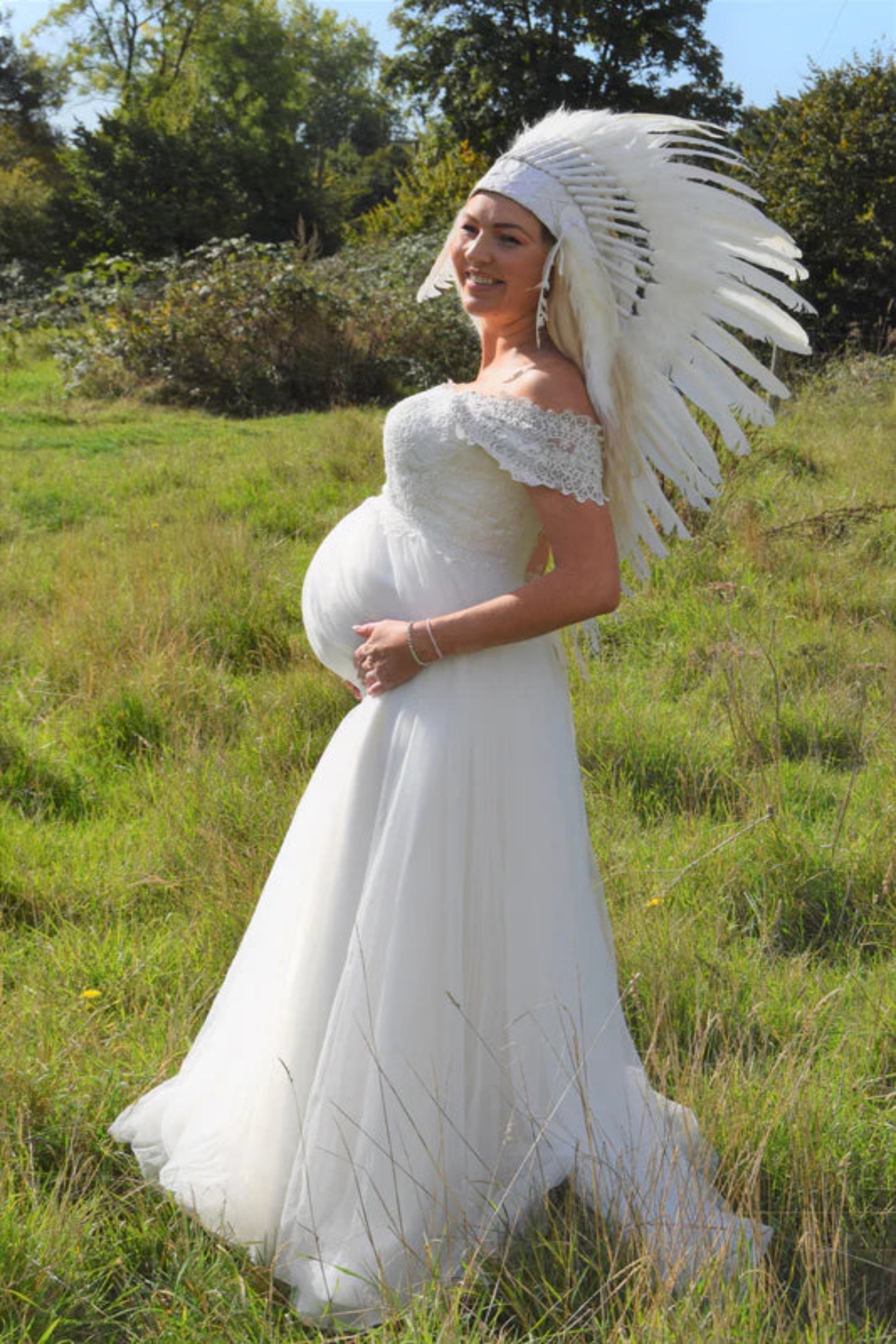 The dress is a maternity dress, as it is tailored to comfortably accommodate a baby bump while still maintaining elegance. The overall effect is ethereal and graceful, giving a bridal or special-occasion vibe.