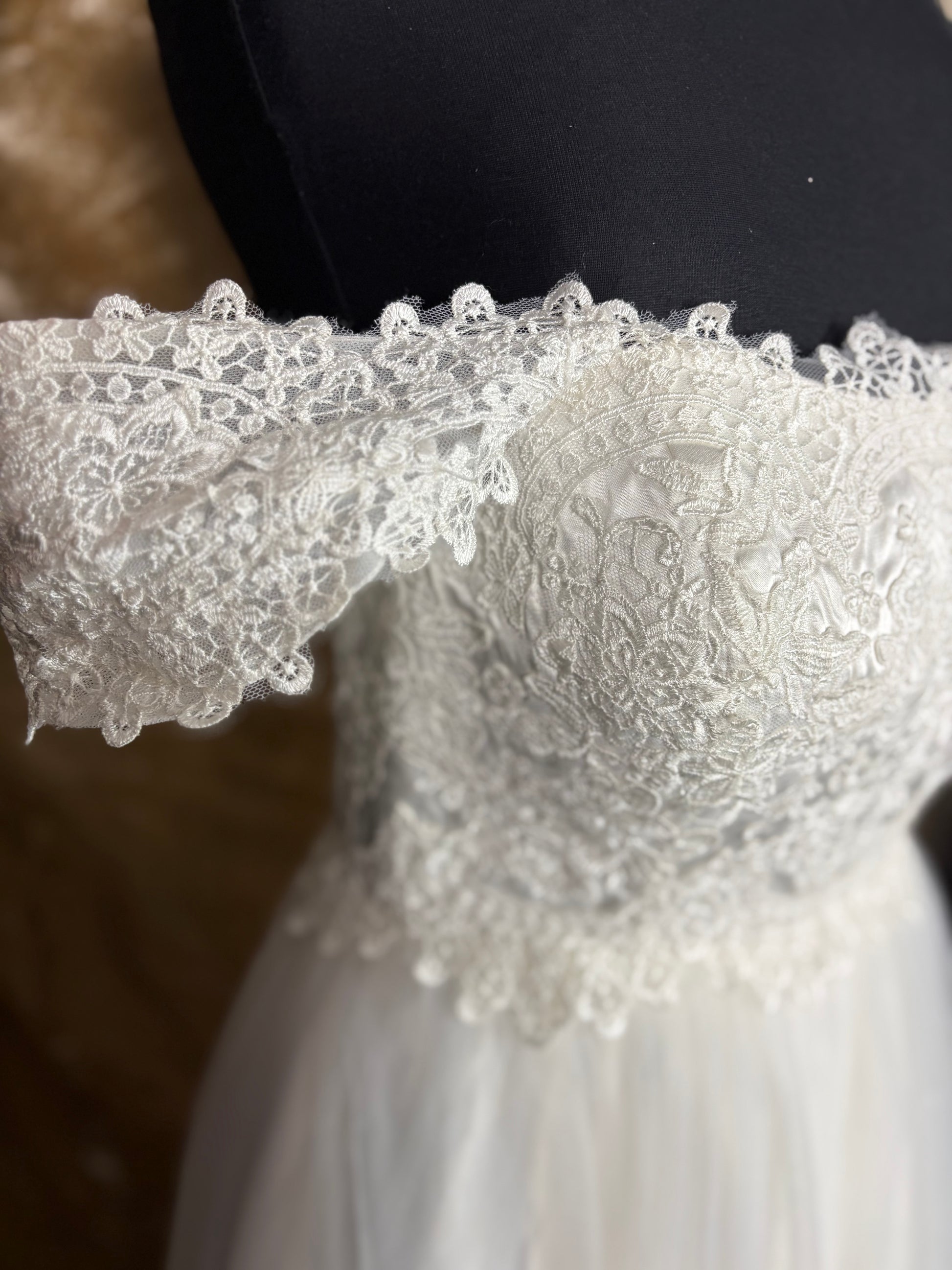 Bumpy Bump is a flowing, floor-length white gown designed in a classic, romantic style. It features an off-the-shoulder neckline with delicate lace trim across the top, adding a soft and feminine touch. The bodice is fitted and emphasises the waistline, while the skirt is made of light, airy fabric that drapes gracefully to the ground, creating a gentle, flowing silhouette.