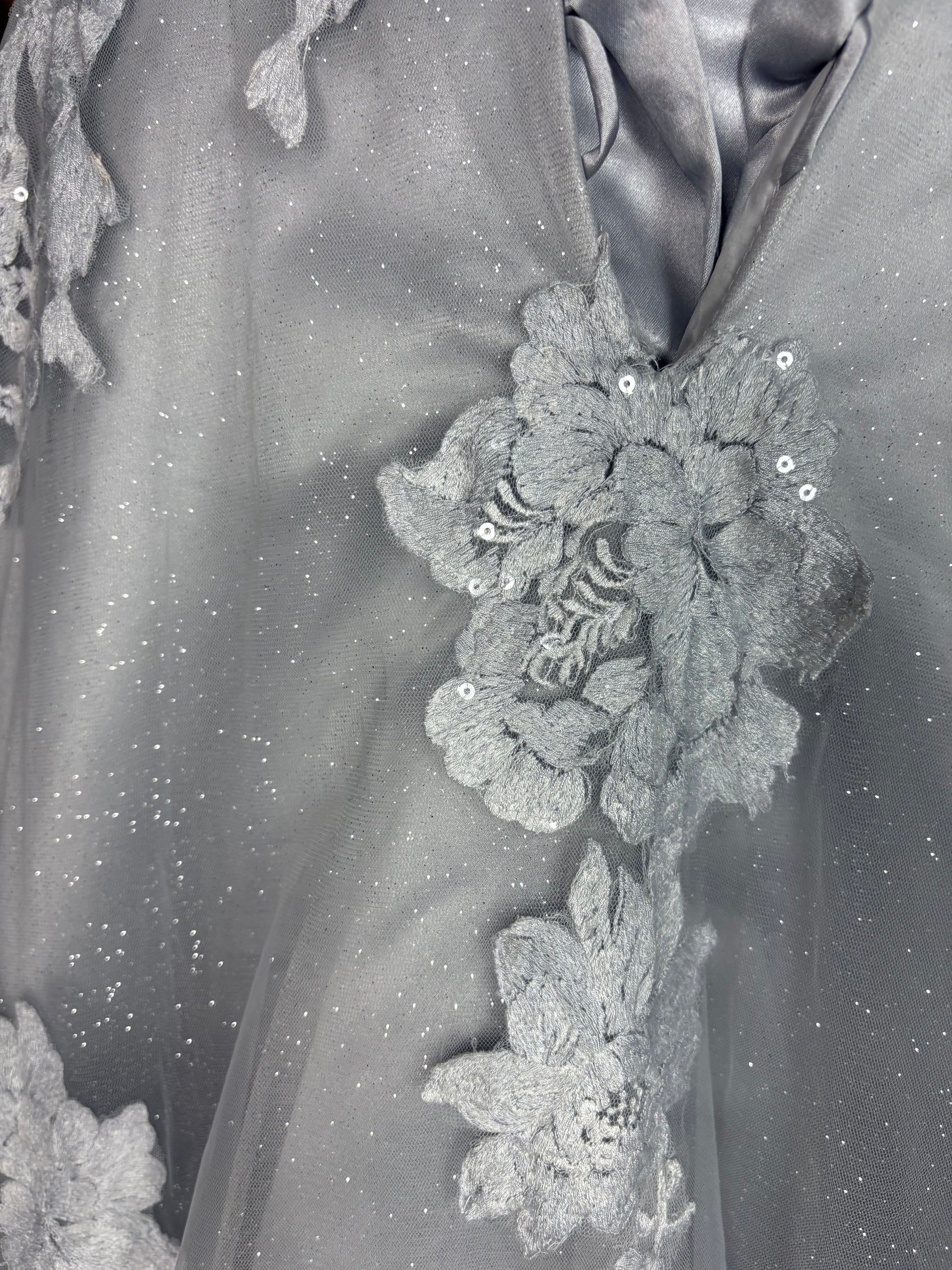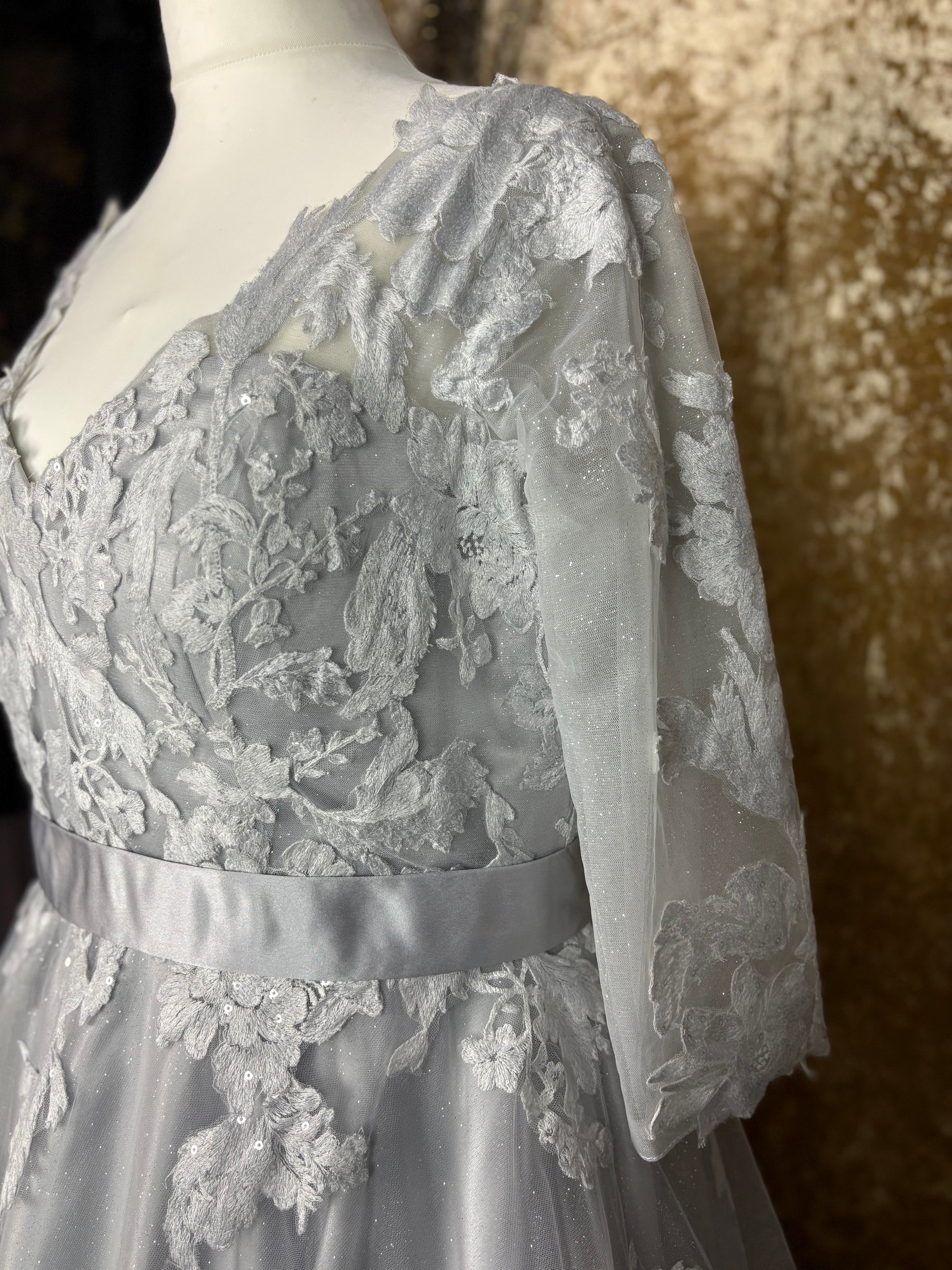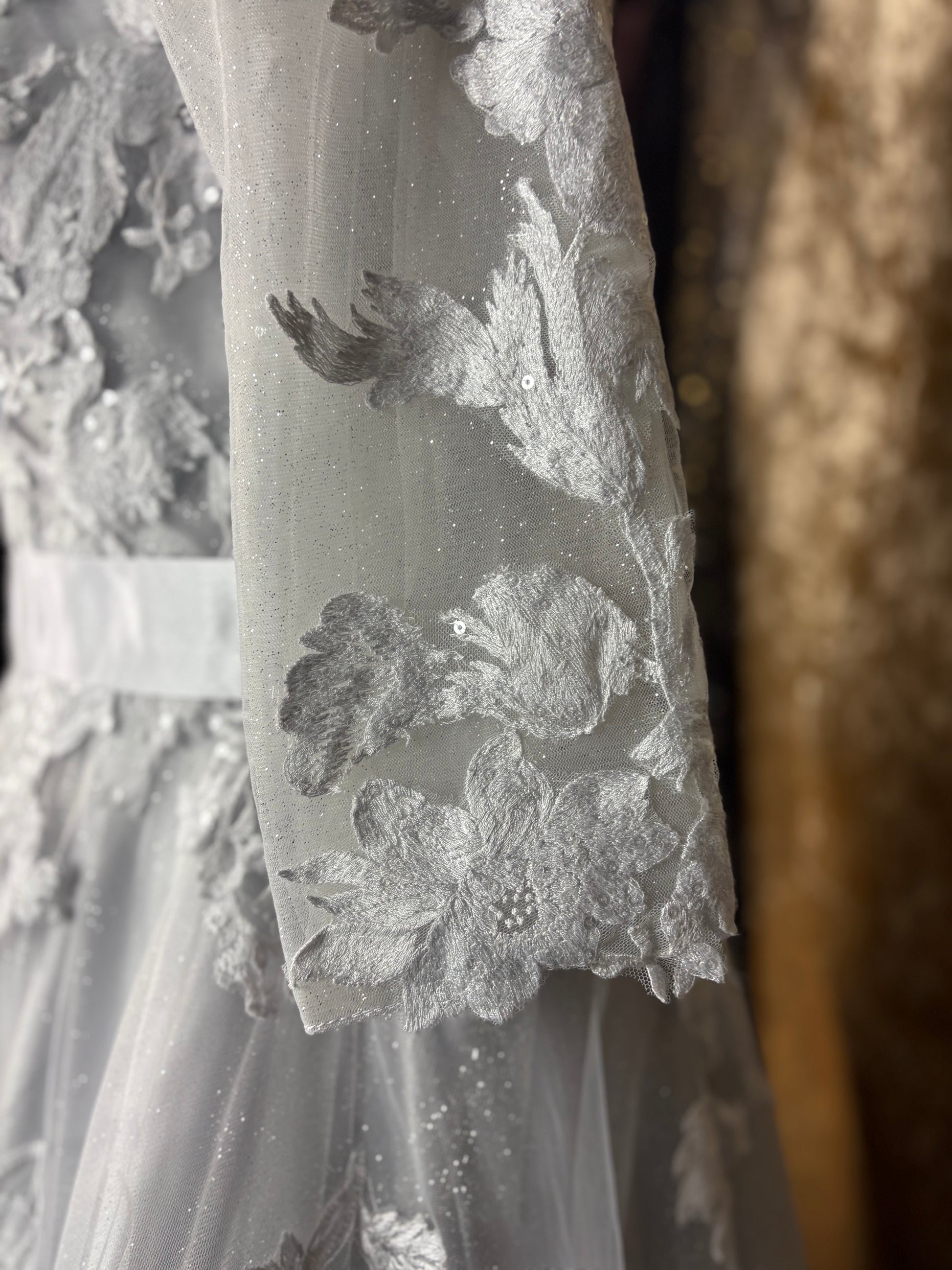 Eyes Of The Storm is a romantic and ethereal gown with a soft, flowing silhouette. It features a fitted bodice with a gentle V-neckline and three-quarter length sheer sleeves, embellished with delicate floral lace appliqué. The glitter tule detail is scattered across the bodice, sleeves, and skirt, adding texture and elegance without overwhelming the design.