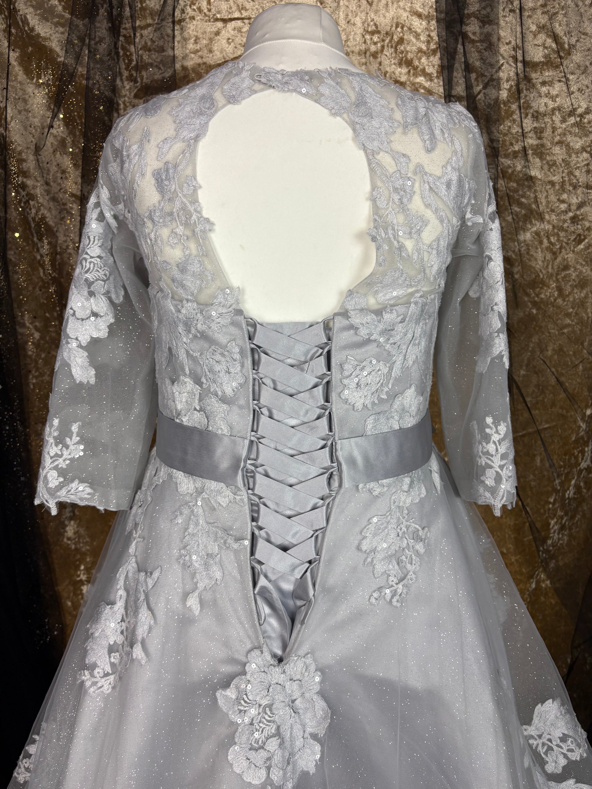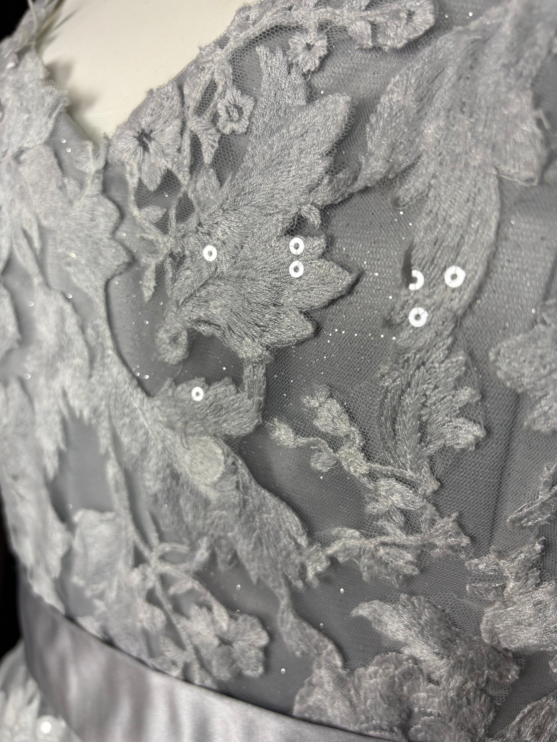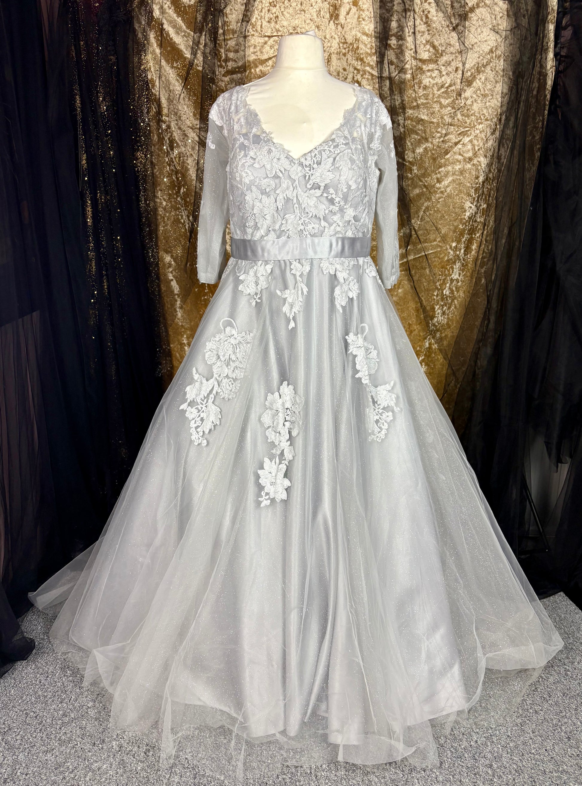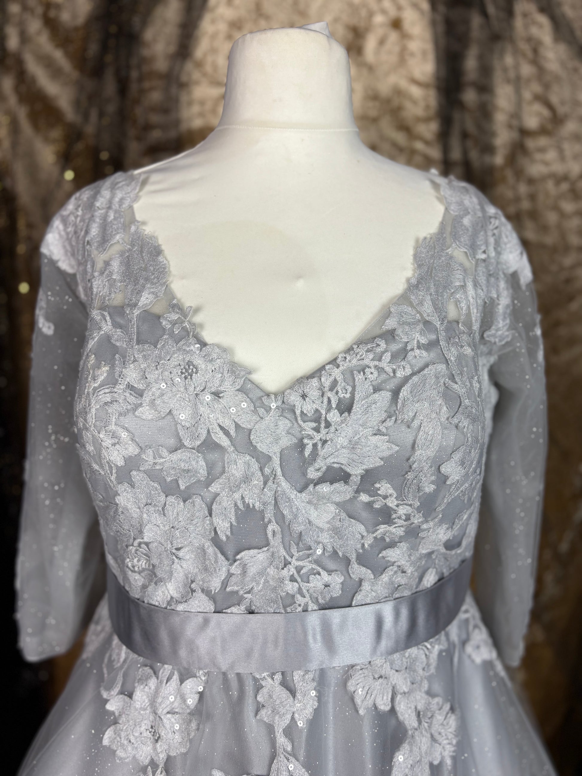 Eyes Of The Storm is a romantic and ethereal gown with a soft, flowing silhouette. It features a fitted bodice with a gentle V-neckline and three-quarter length sheer sleeves, embellished with delicate floral lace appliqué. The glitter tule detail is scattered across the bodice, sleeves, and skirt, adding texture and elegance without overwhelming the design.
