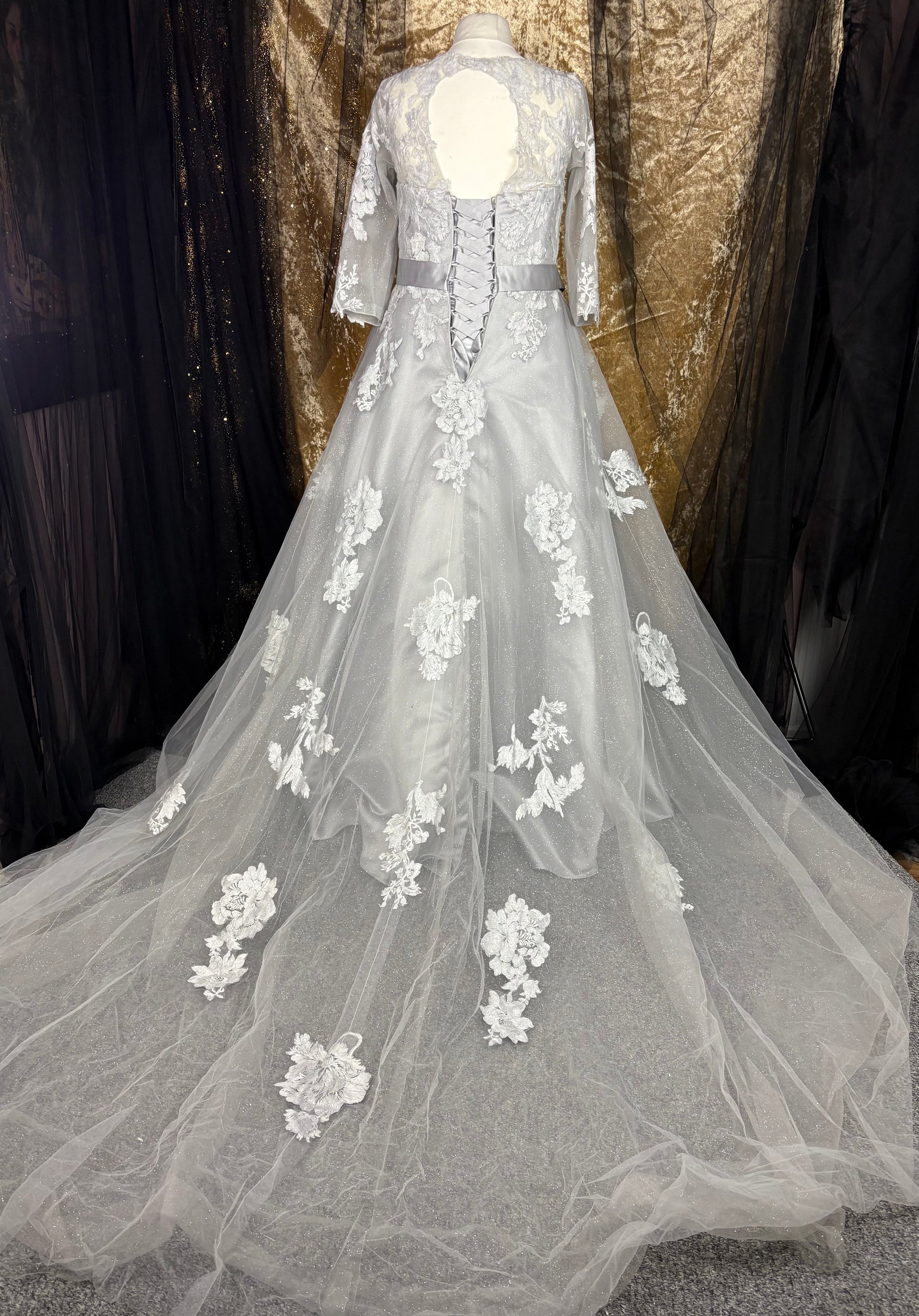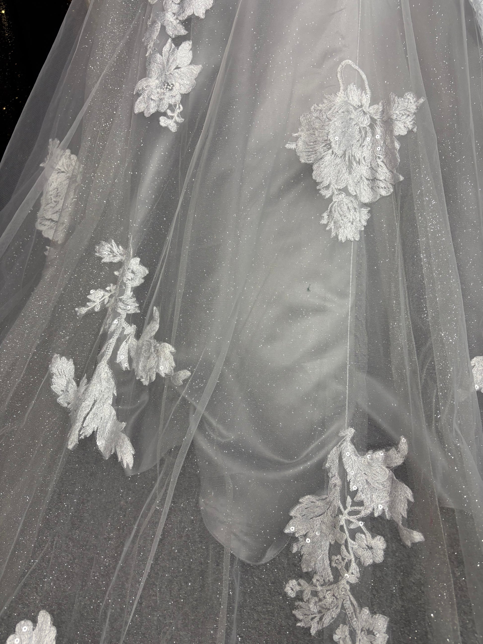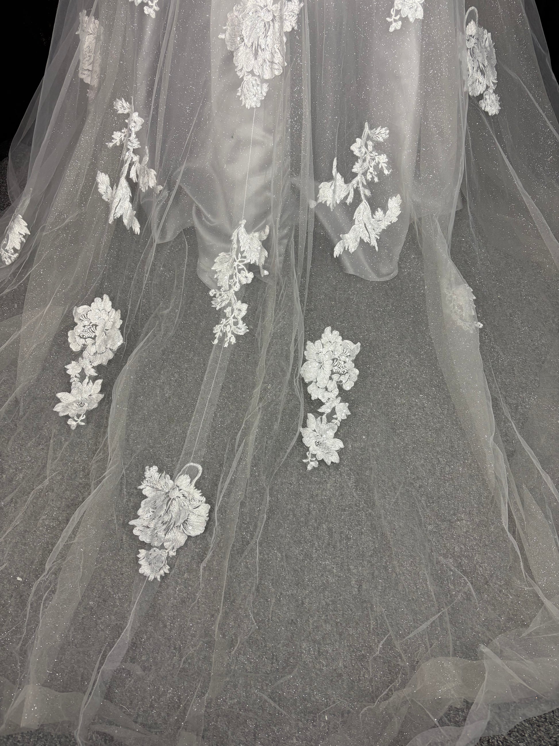 The skirt is full and layered with light, sheer fabric that creates volume and movement, extending into a dramatic train that spreads beautifully on the ground. The floral appliqués also appear on the skirt and train, giving a dreamy, garden-inspired effect. The subtle pale tones — with a hint of blue or silver — make it unique compared to traditional pure white gowns.