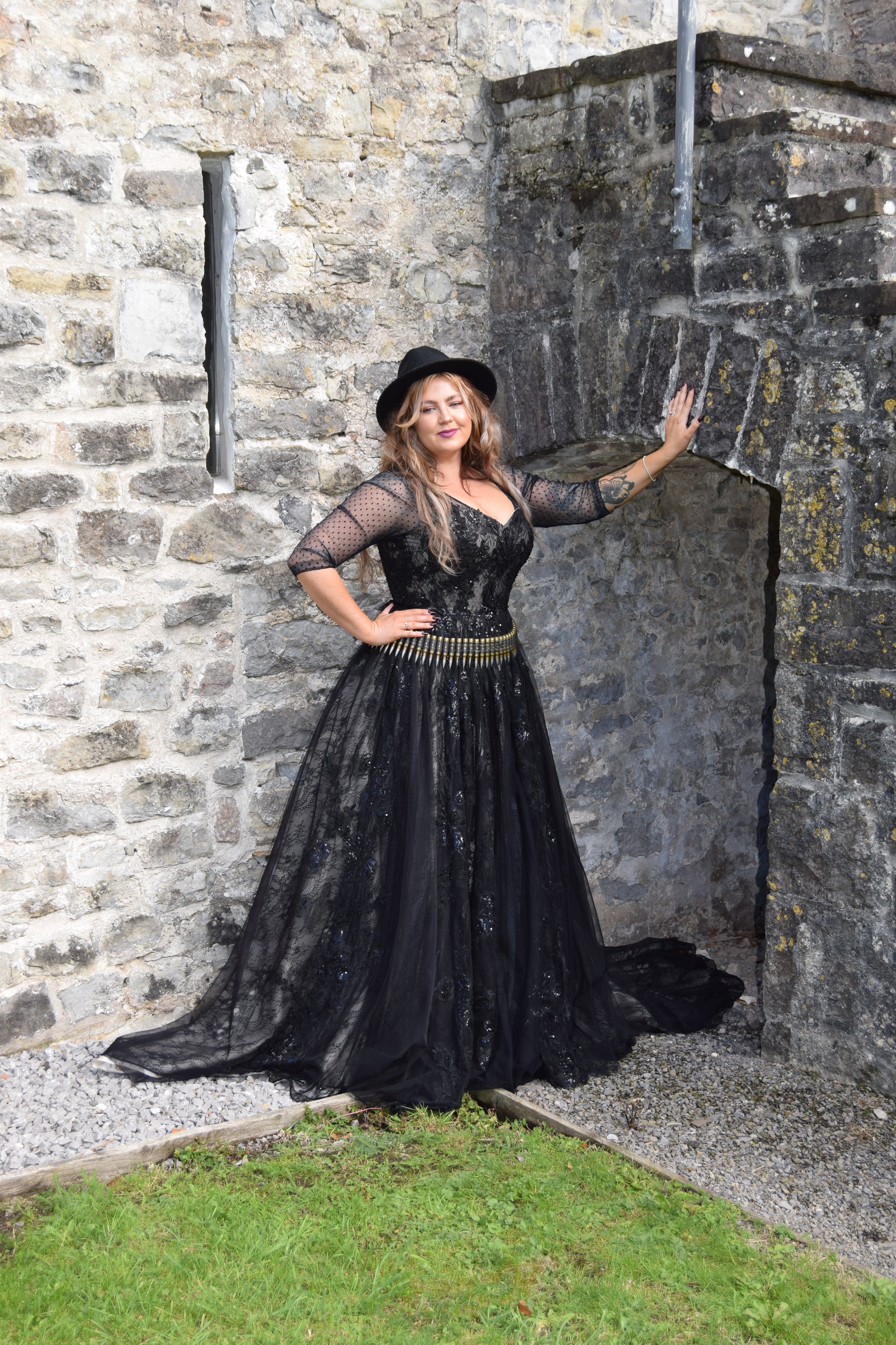 Meanie Queenie is a dramatic and elegant black gown with a gothic-inspired flair. It features a fitted bodice with a sweetheart neckline, overlaid with sheer black mesh. The sleeves are subtly dotted, adding texture and contrast against the smooth lace of the gown.