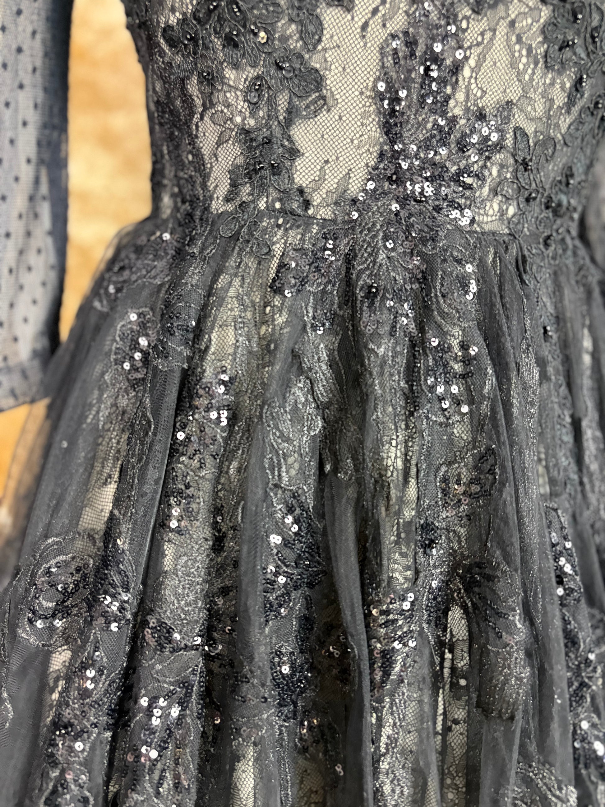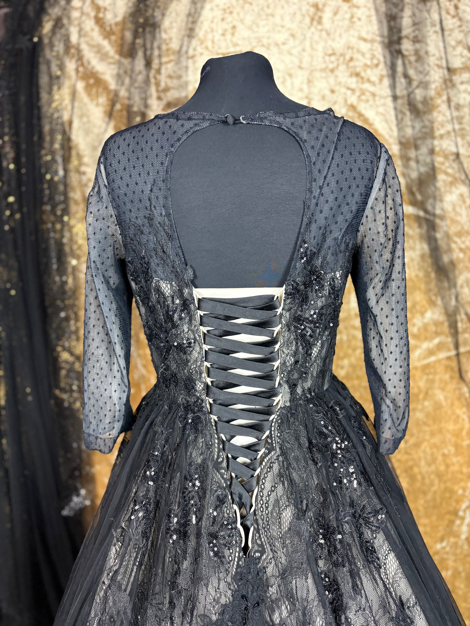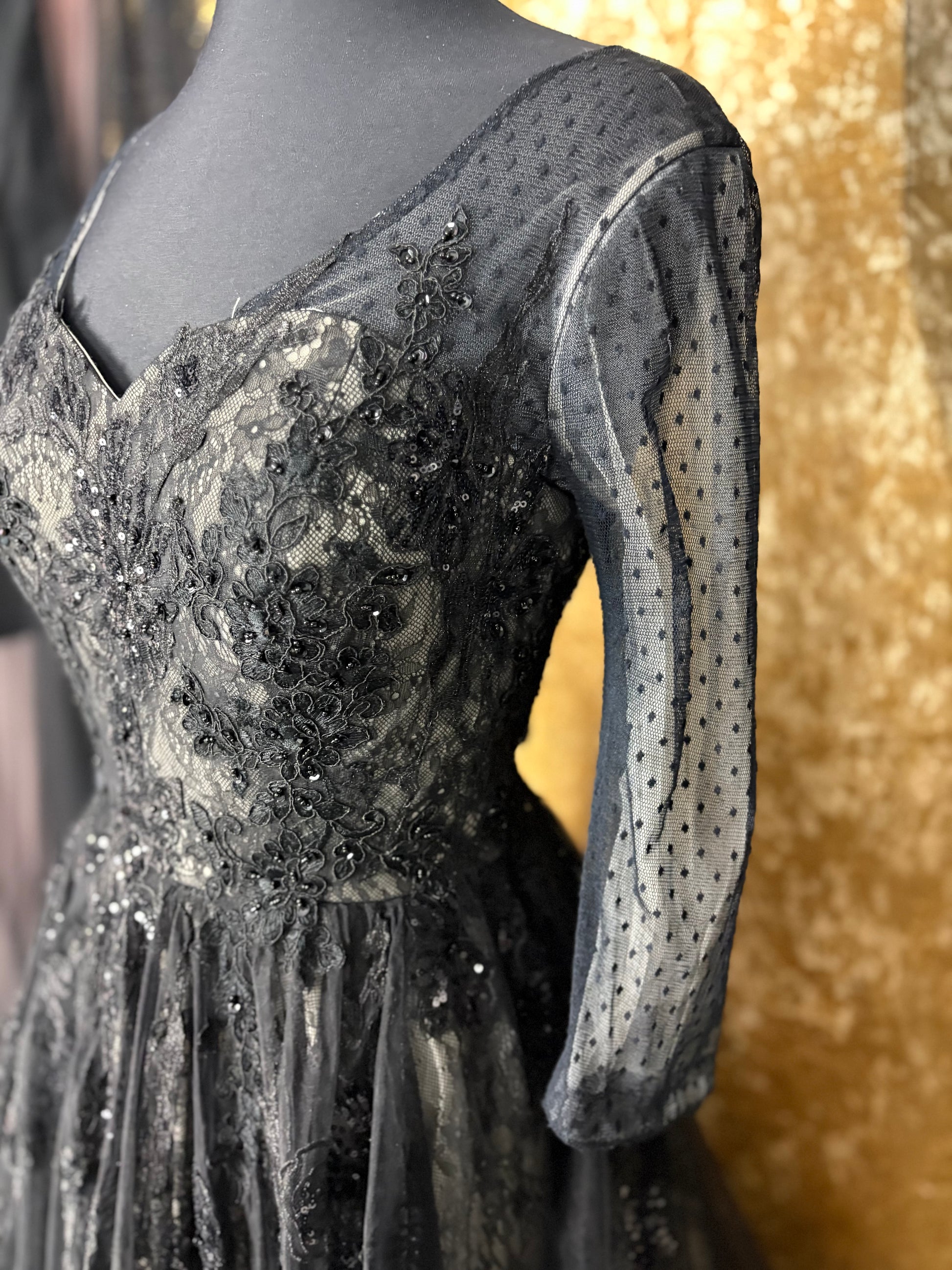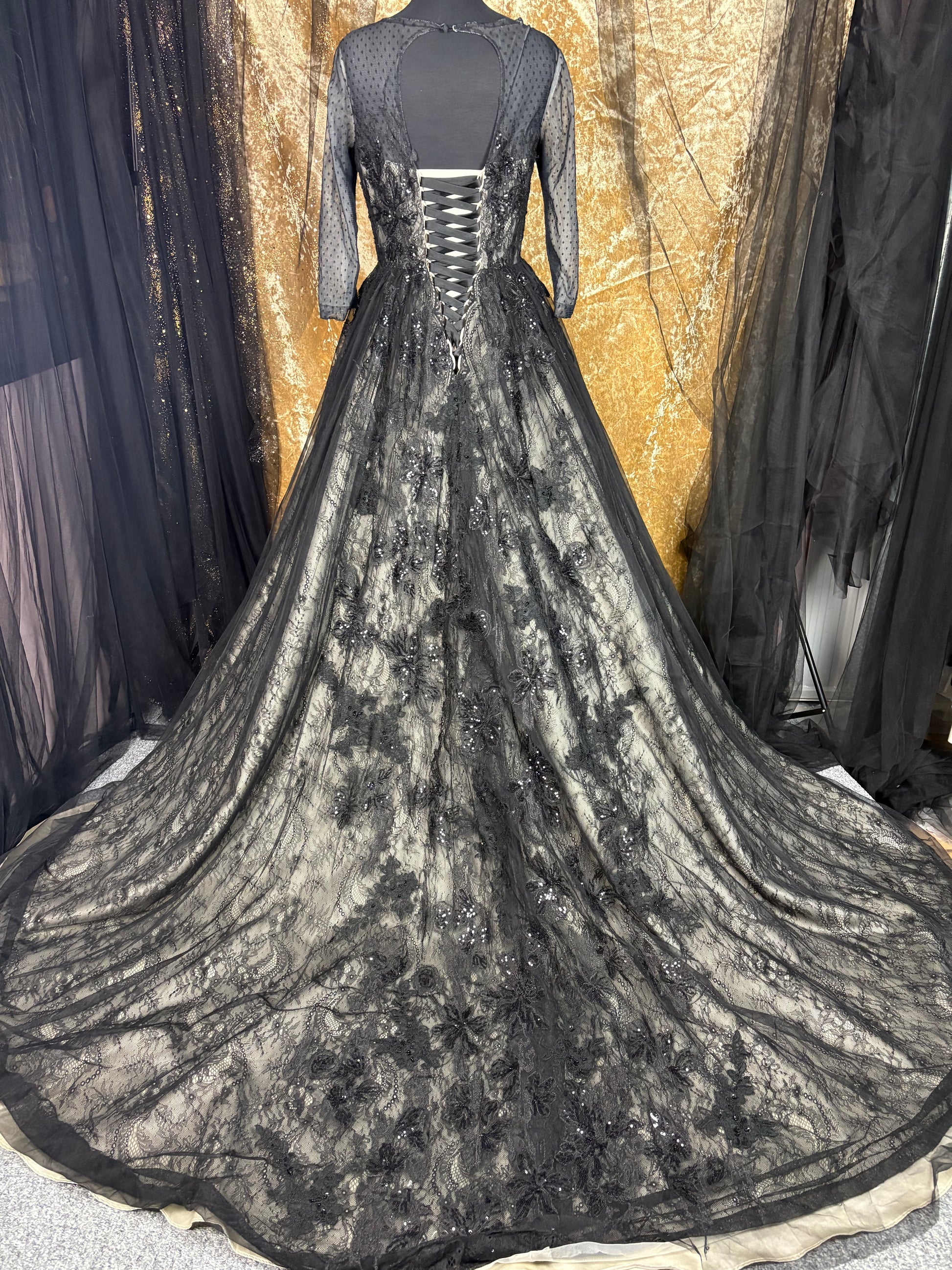 The bodice and skirt are richly decorated with dark lace and sequin applique embellishments that catch the light, giving the dress a mysterious shimmer.