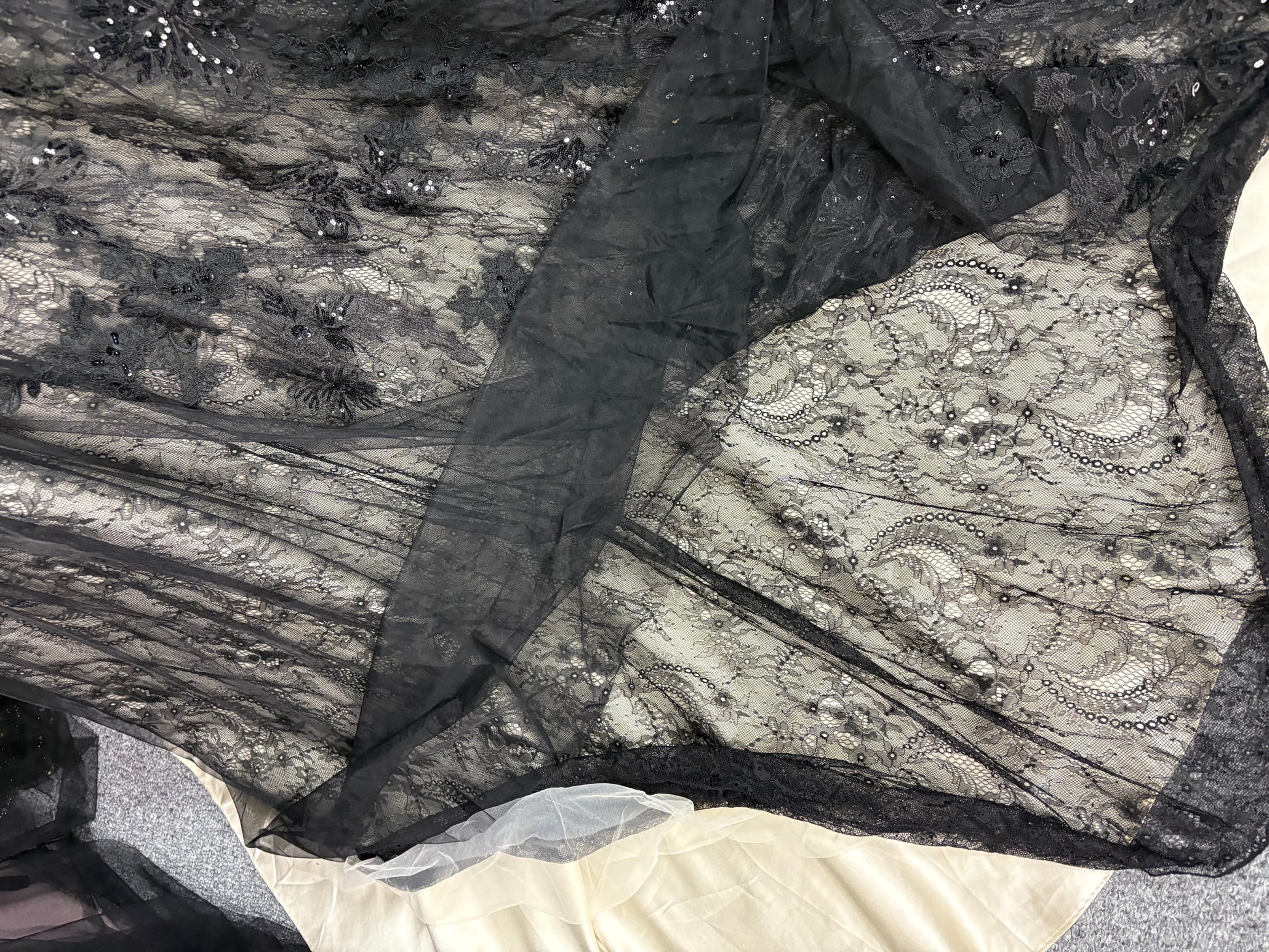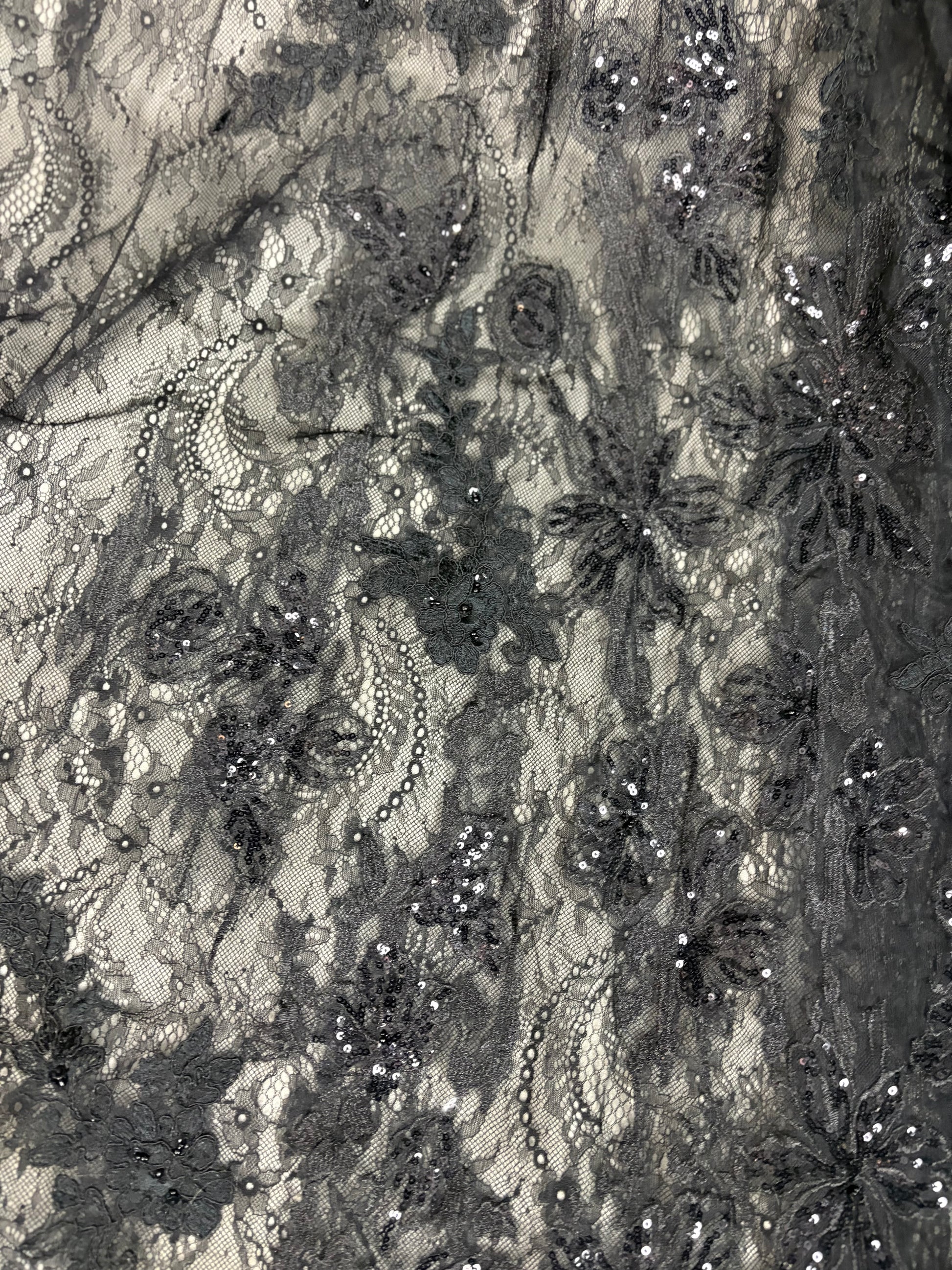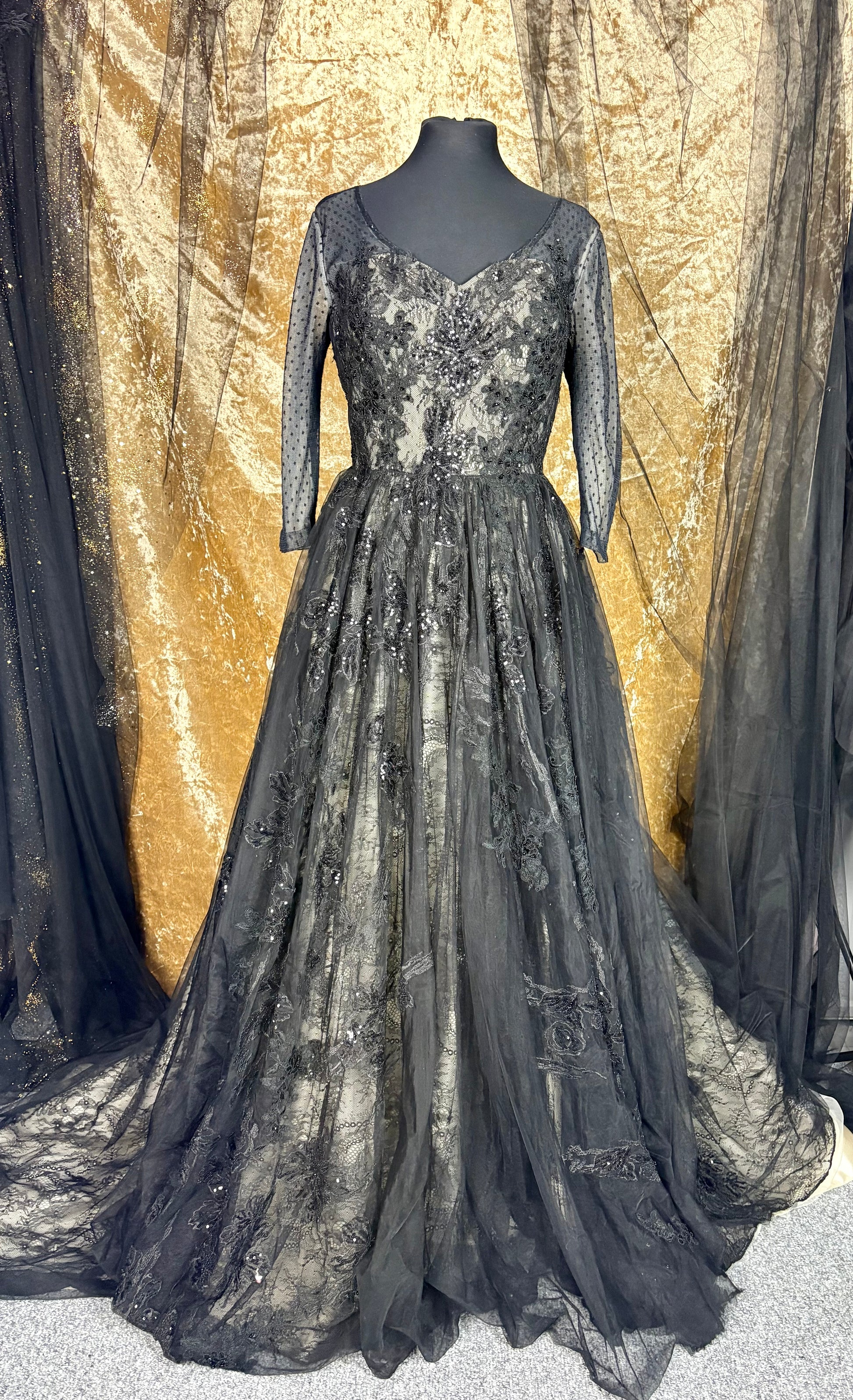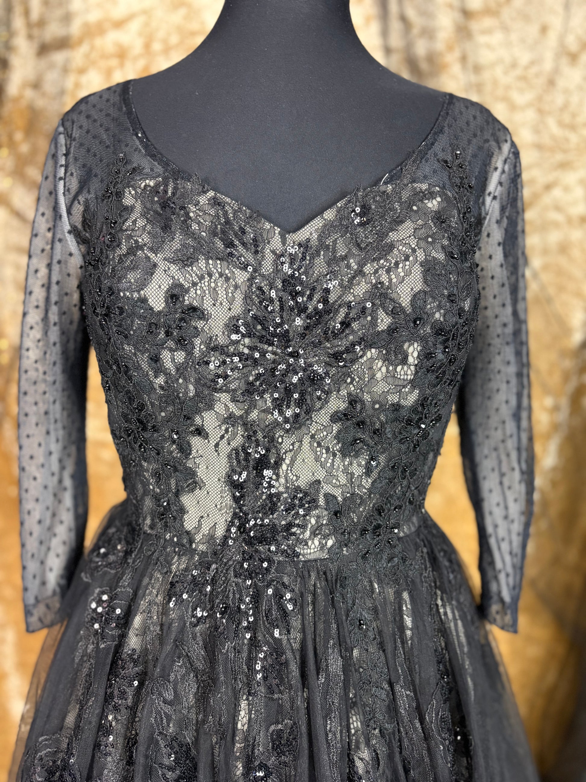 The bodice and skirt are richly decorated with dark lace and sequin applique embellishments that catch the light, giving the dress a mysterious shimmer.