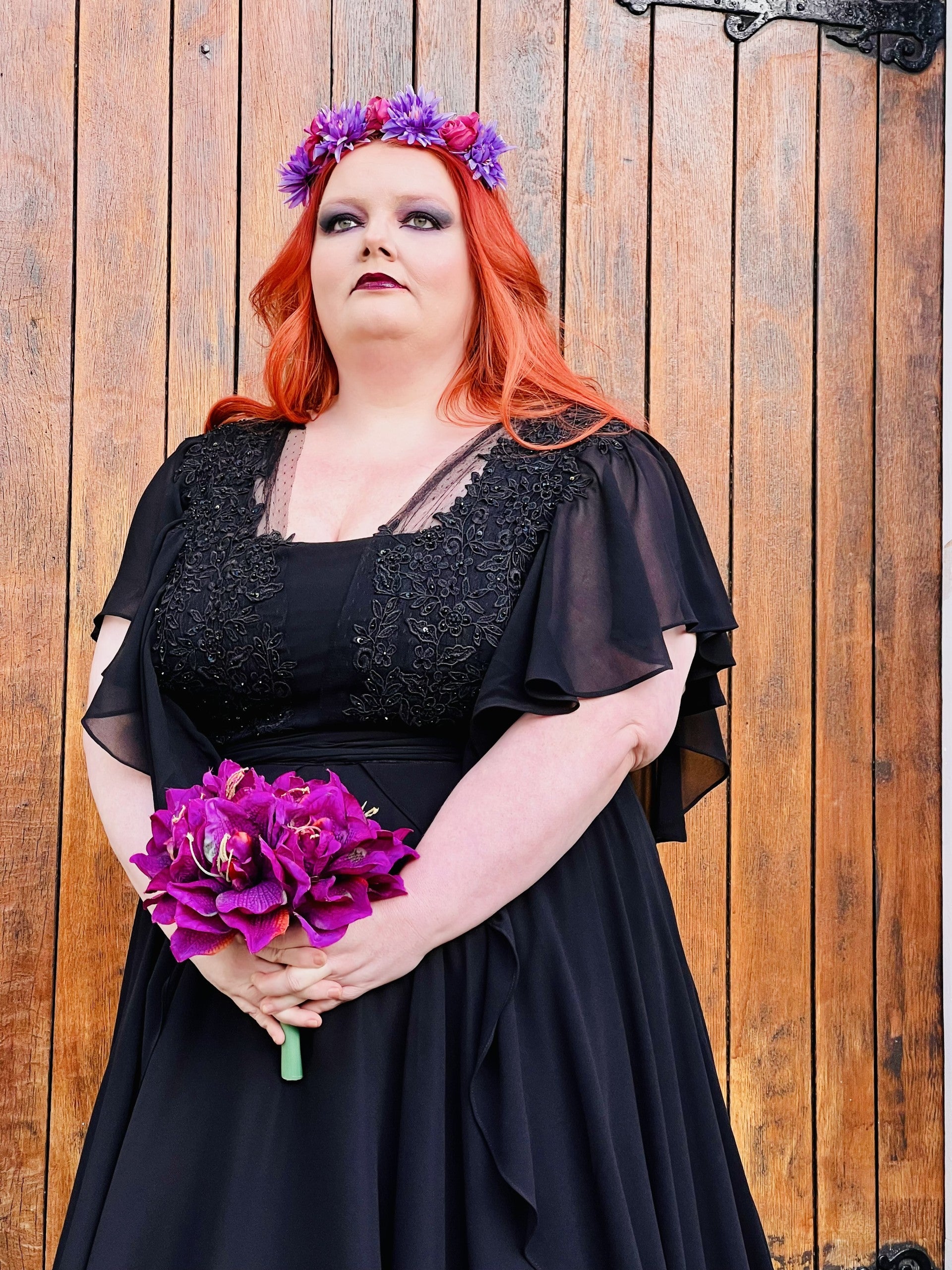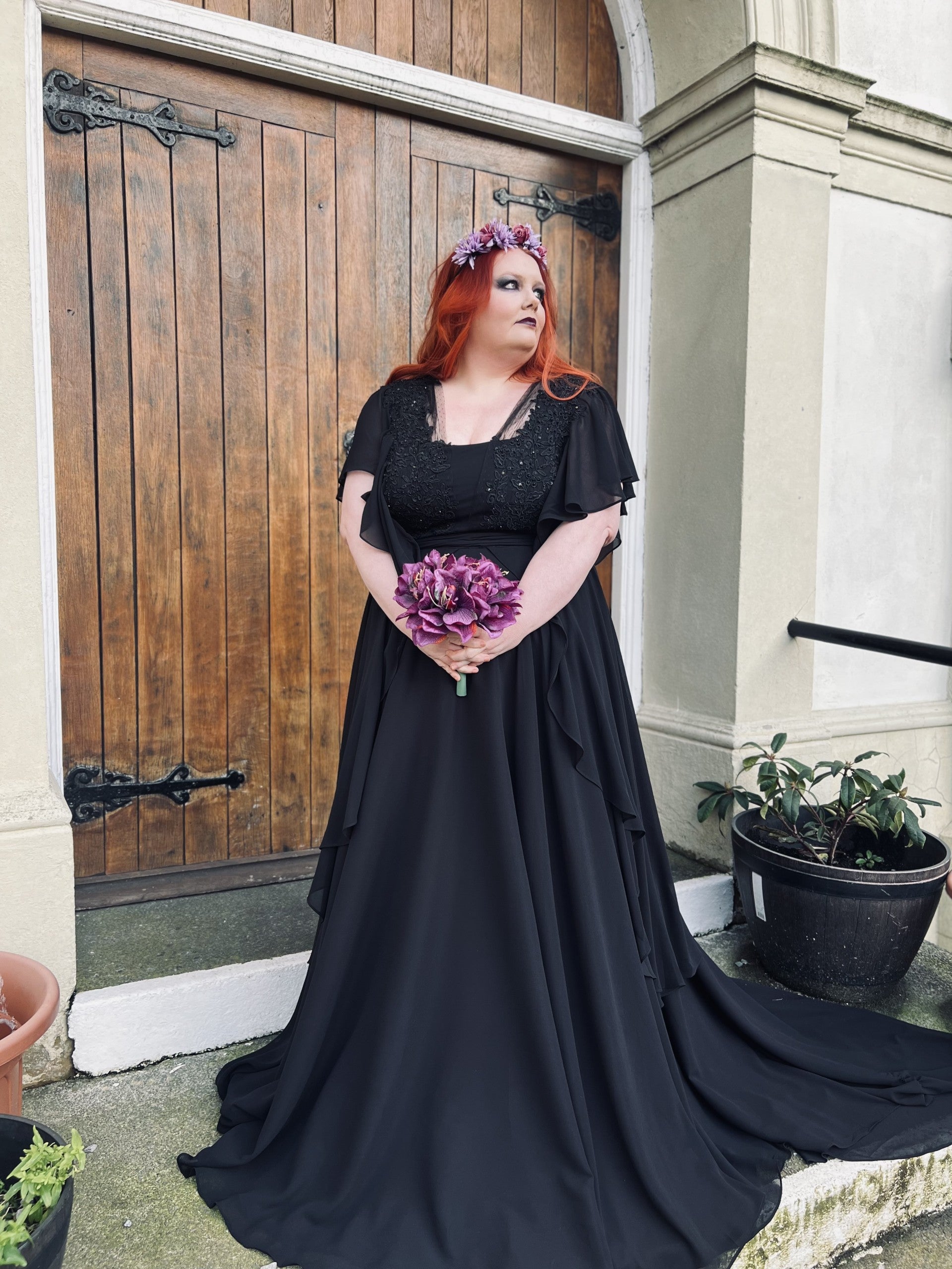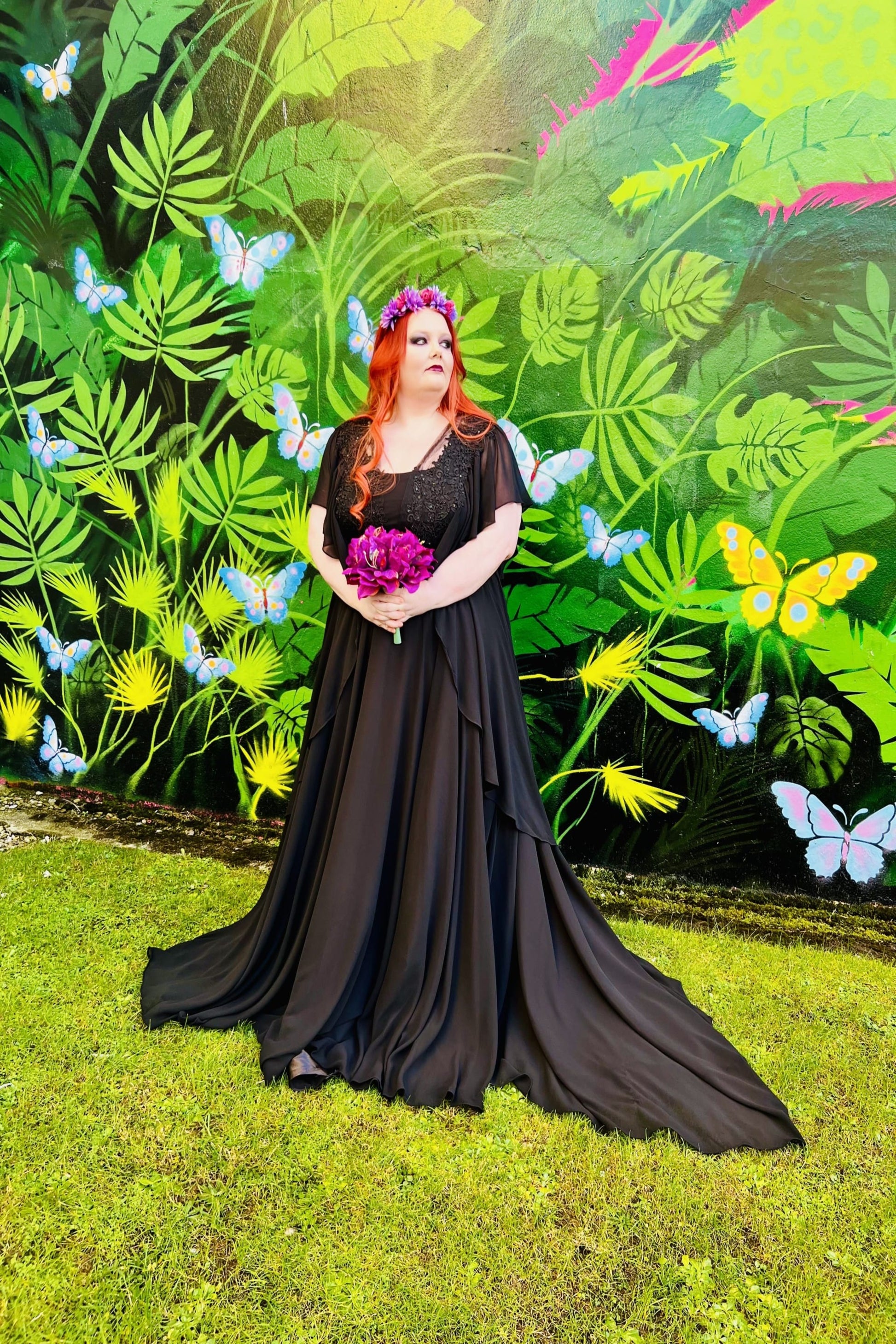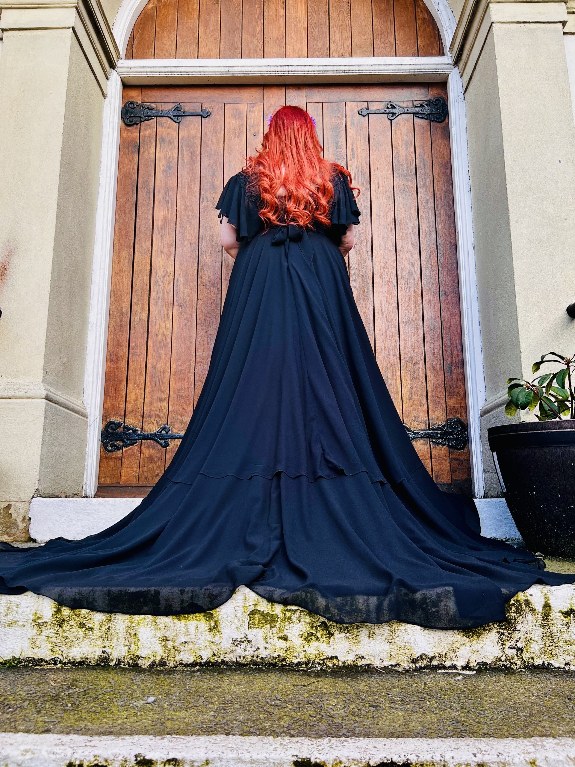 The Boho Biatch gown is a breathtaking cascade of midnight silk, spilling to the earth in endless rivers of black, as if the night sky itself had unraveled at your feet. Layers of fabric sweep dramatically outward, their liquid motion conjuring the grandeur of a gothic queen striding through a dream. The bodice glimmers with jewelled accents that catch the light like constellations, while sheer sleeves float around you like whispers of shadow, ethereal and untamed.