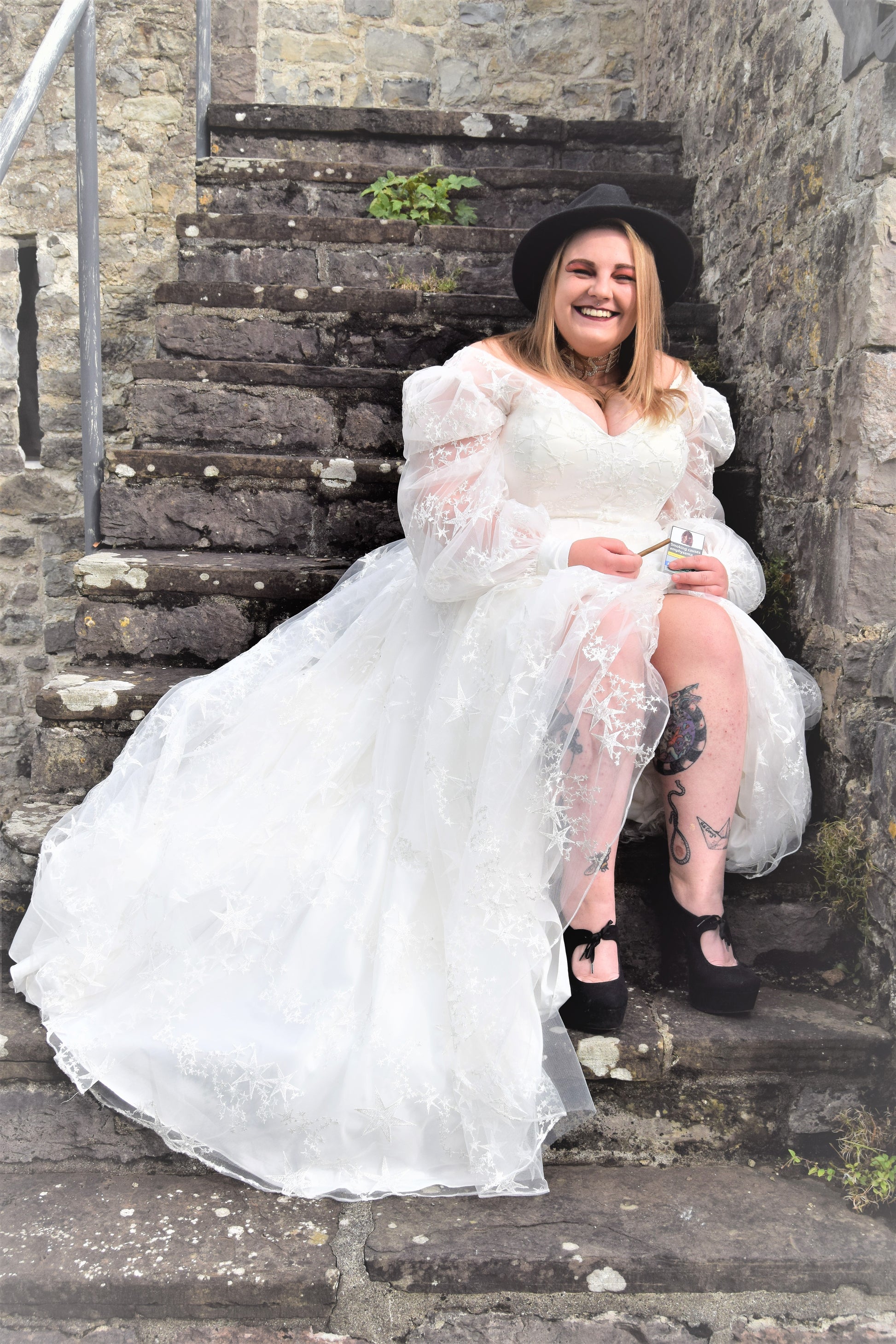 The overall look balances elegance with a fun twist—perfect for someone who wants a nontraditional gown with personality and charm.