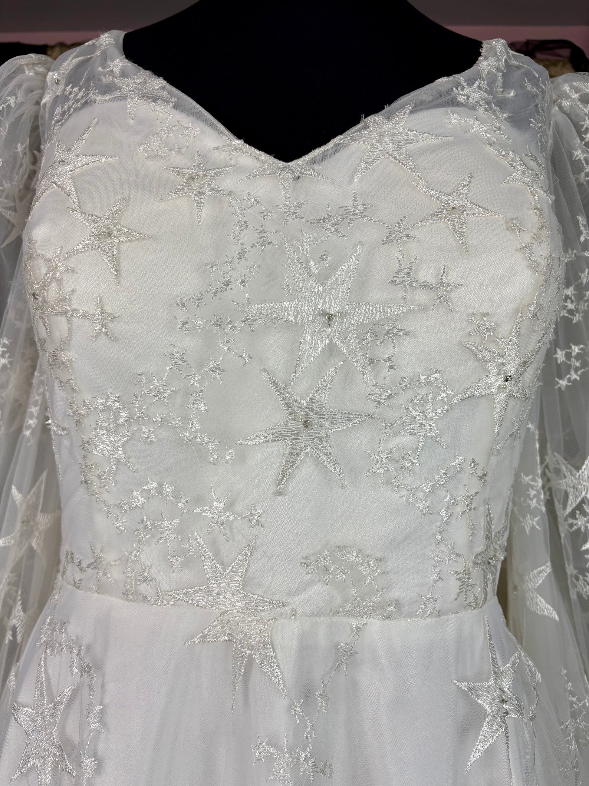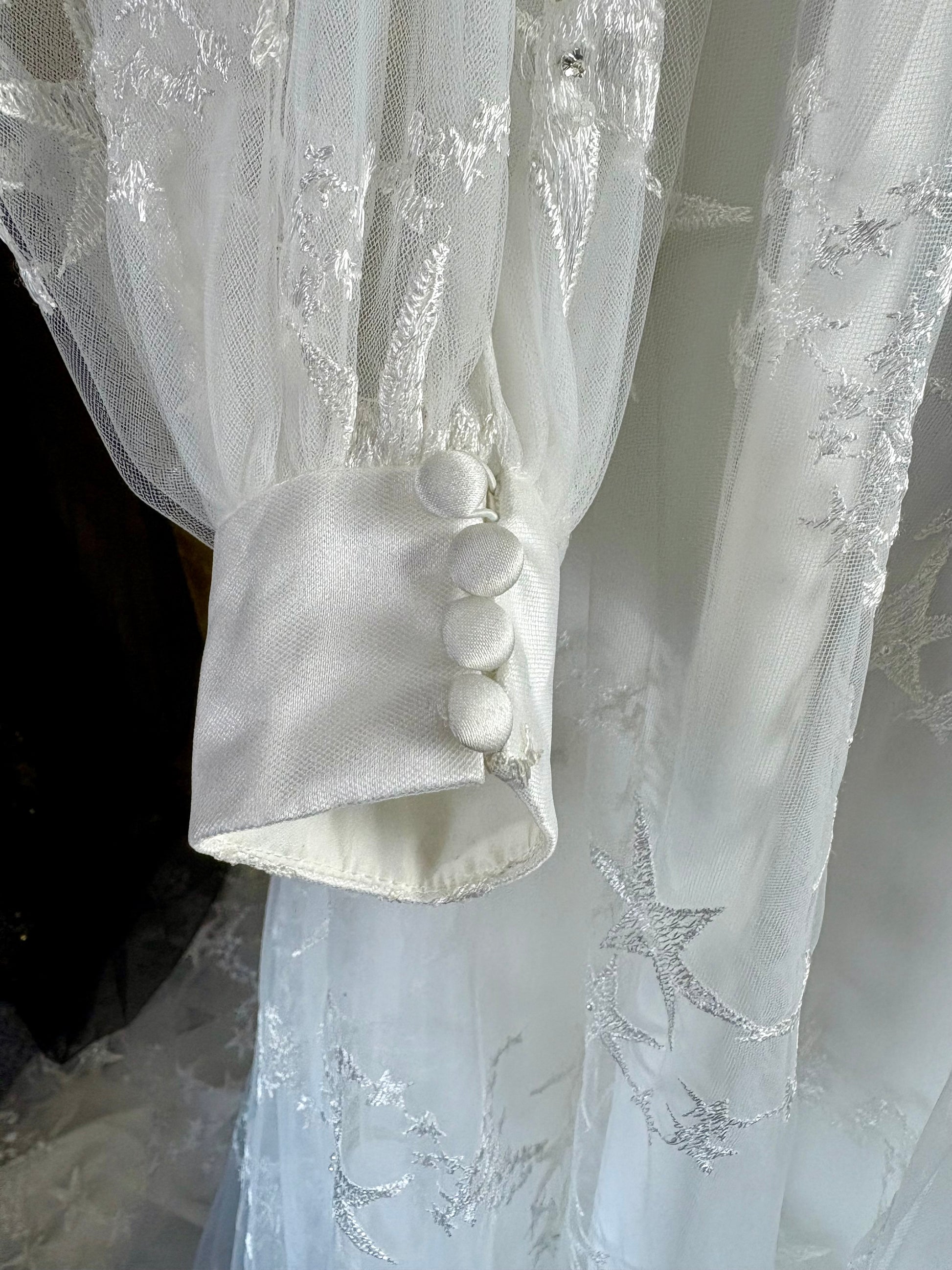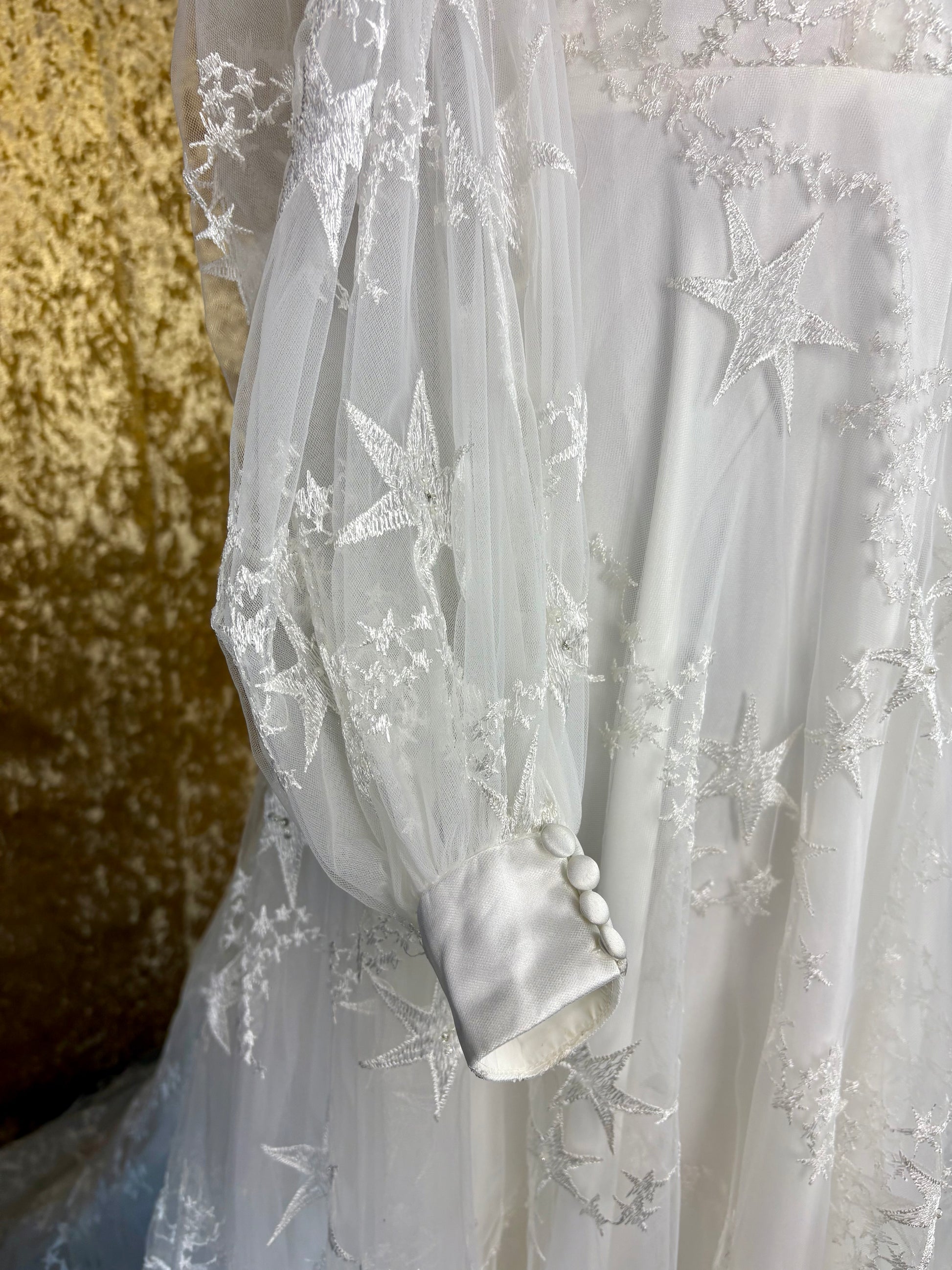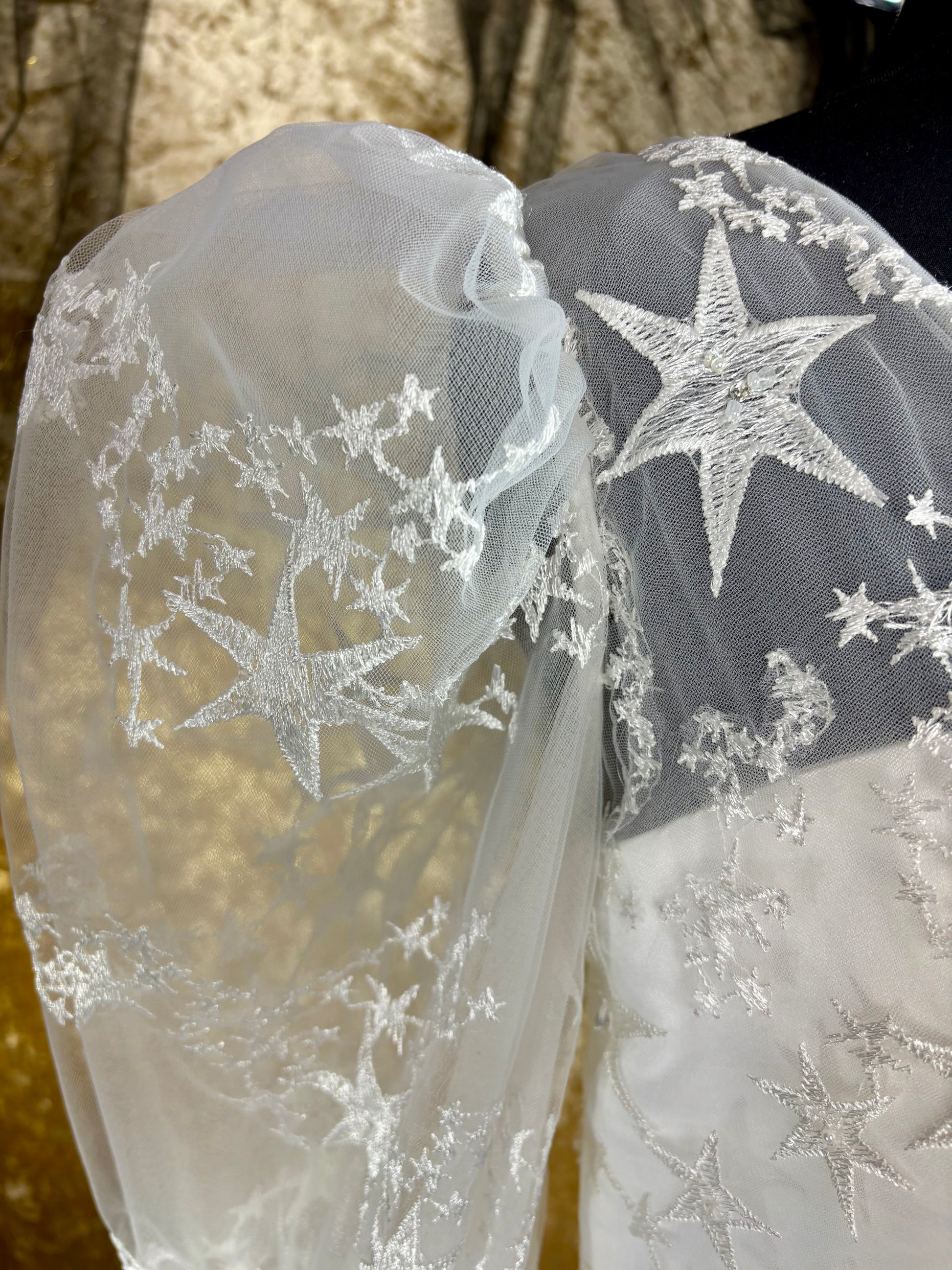 The standout feature is the fabric itself: sheer layers embroidered with delicate star patterns that sparkle softly against the light, giving the gown a magical, starlit effect. The sleeves are dramatic and voluminous, made from airy tulle that puffs out before tapering at the wrists, adding a touch of fantasy and vintage flair.