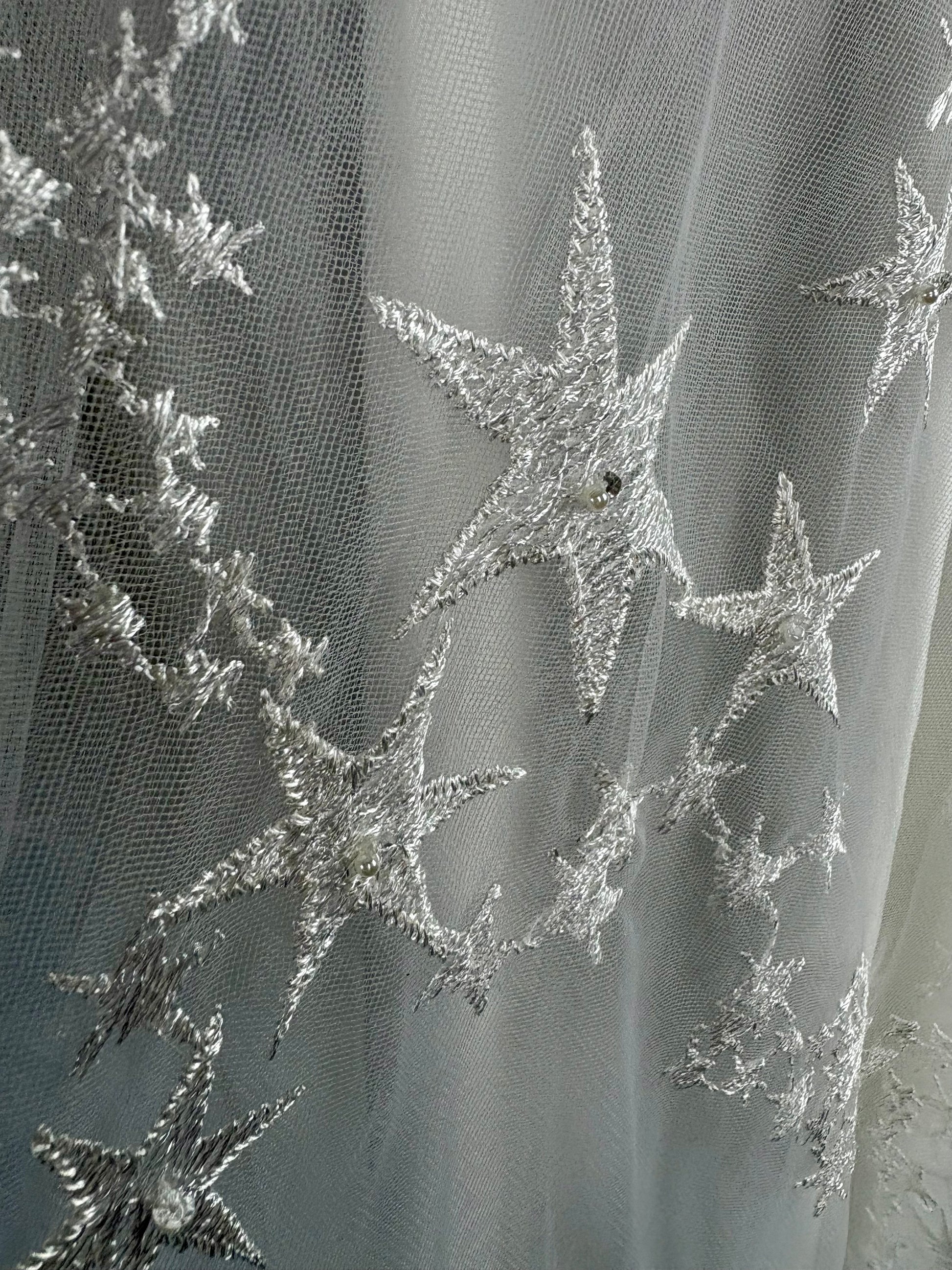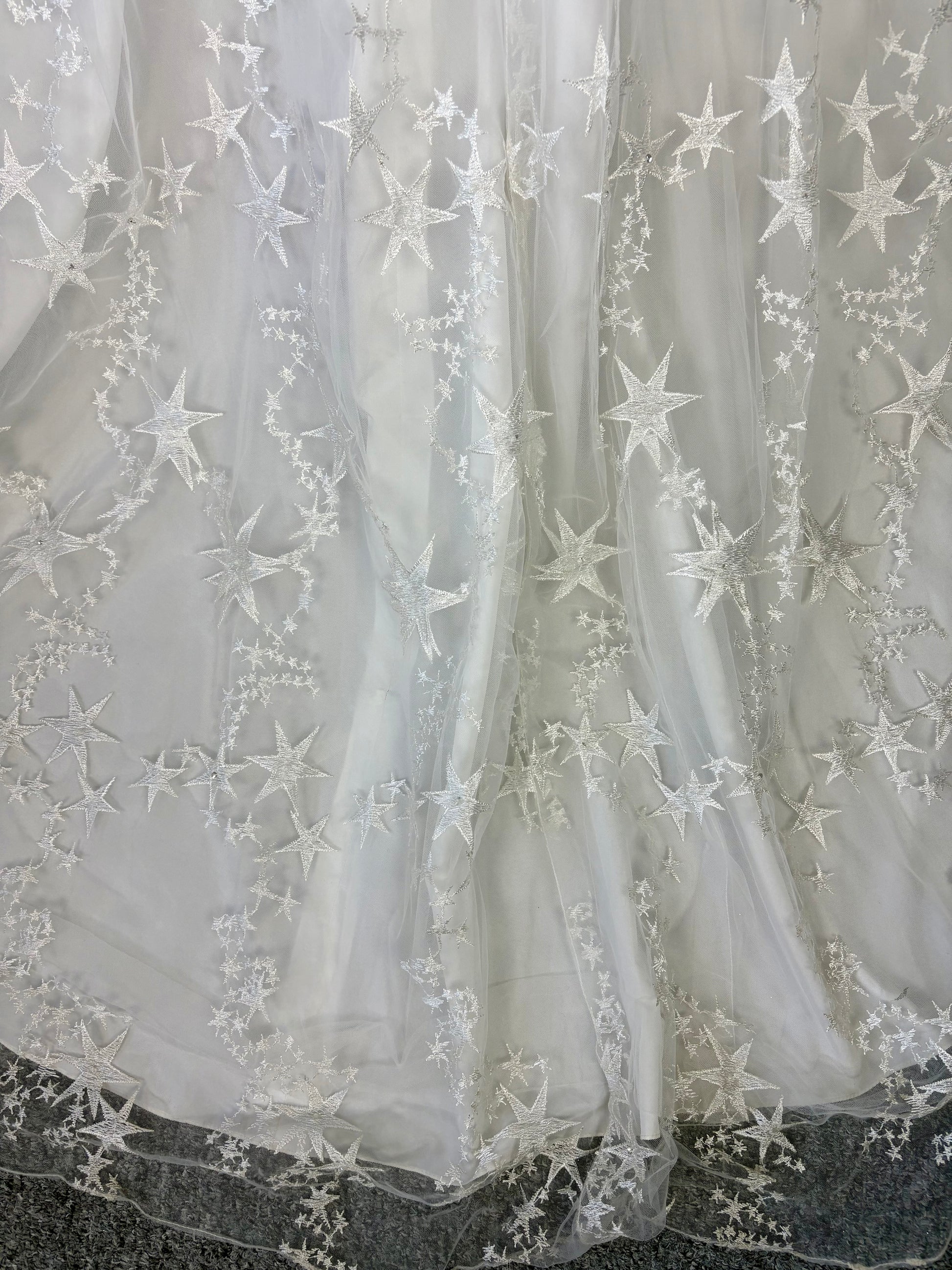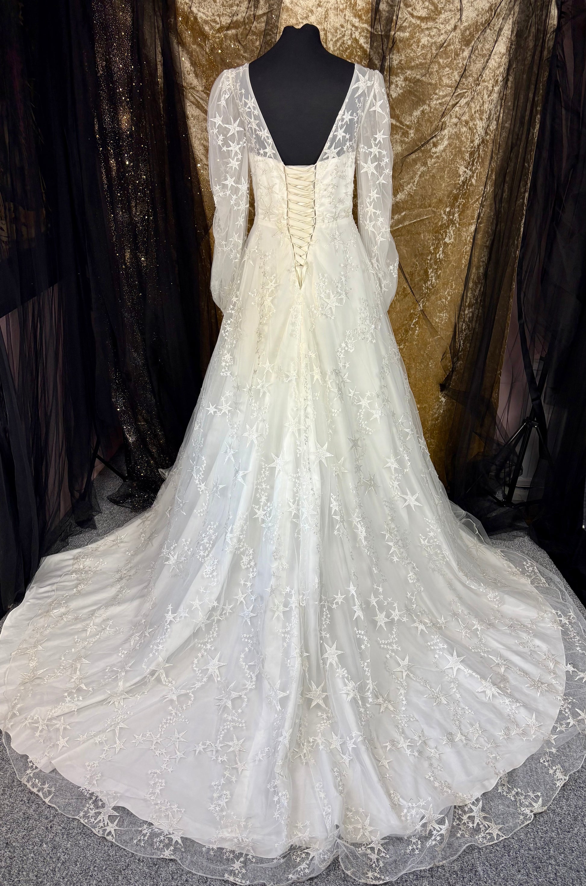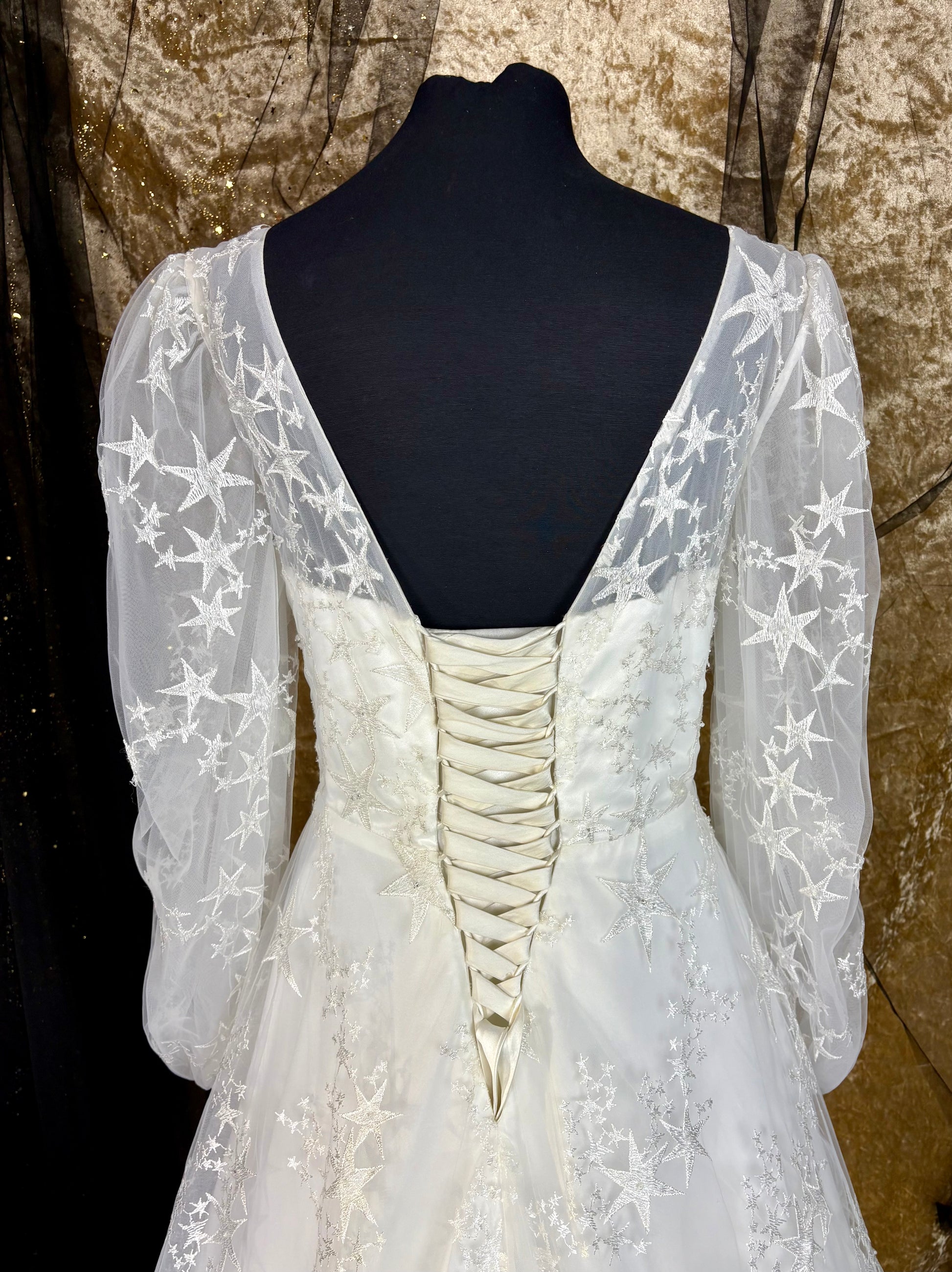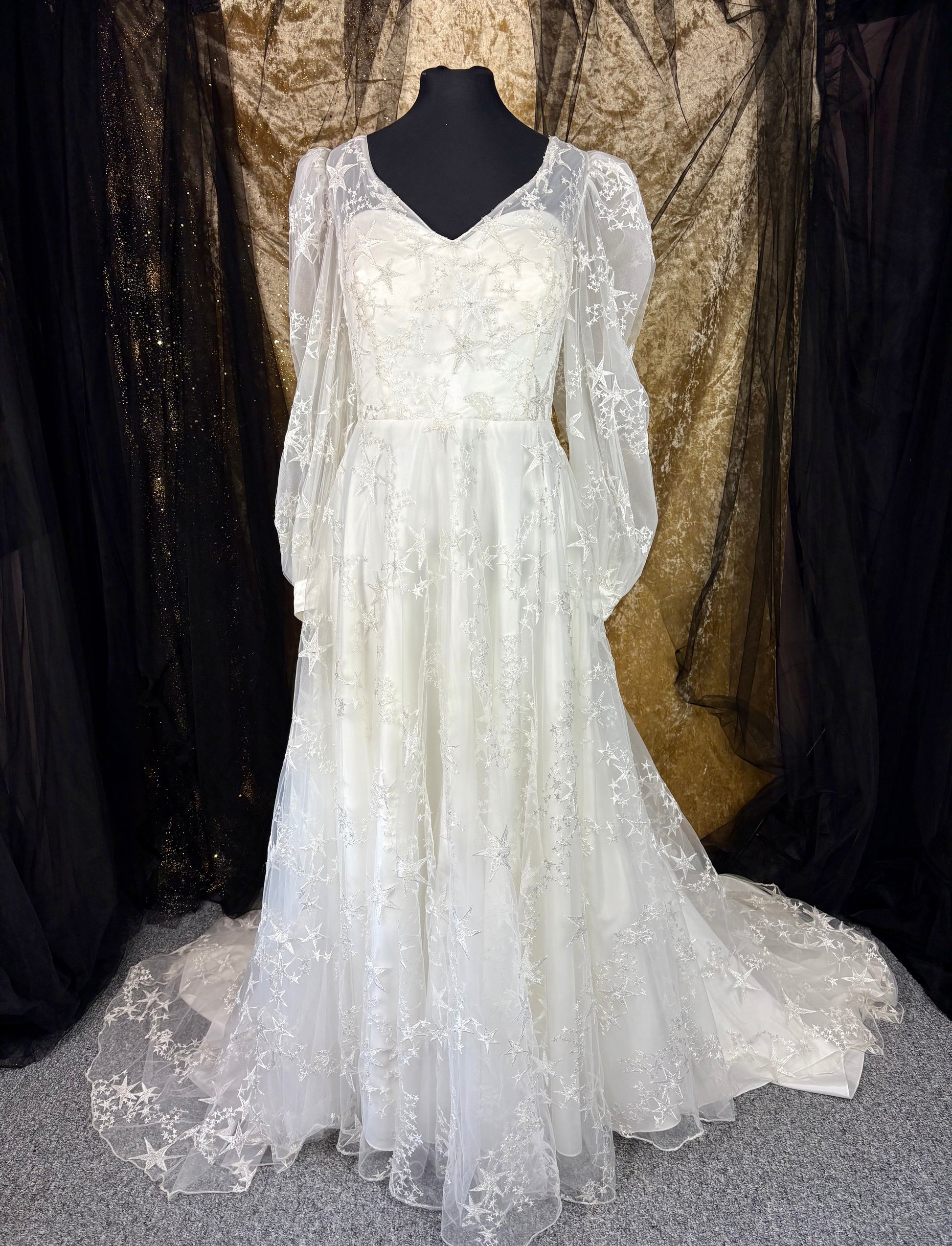 The standout feature is the fabric itself: sheer layers embroidered with delicate star patterns that sparkle softly against the light, giving the gown a magical, starlit effect. The sleeves are dramatic and voluminous, made from airy tulle that puffs out before tapering at the wrists, adding a touch of fantasy and vintage flair.