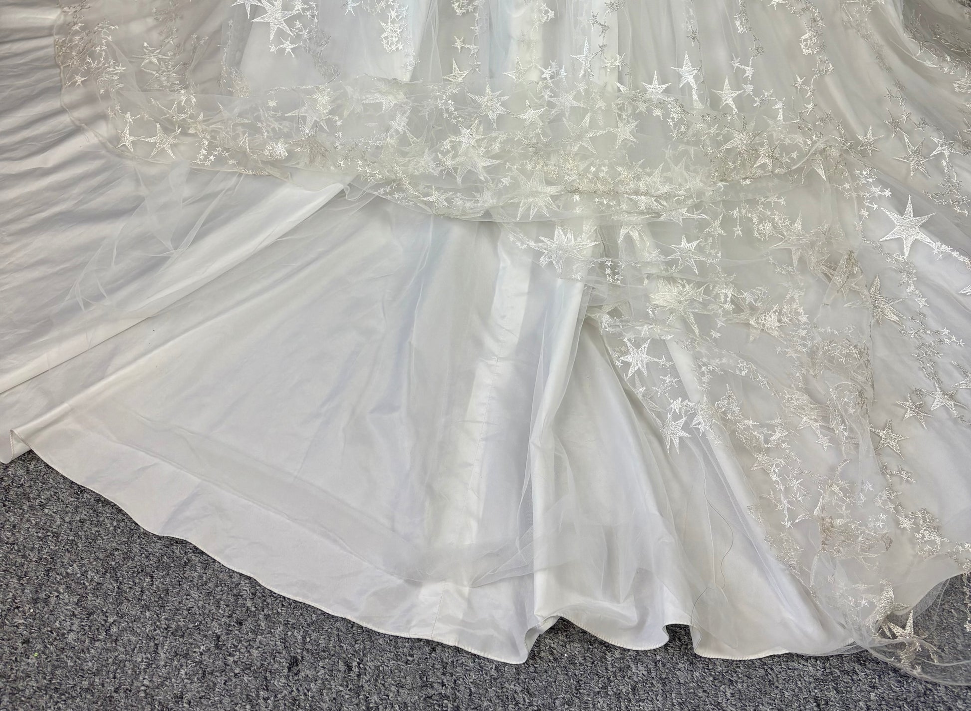 She's Just A Cosmic Girl is a playful yet romantic white gown with a whimsical celestial theme. The bodice is fitted with a sweetheart neckline, creating a flattering shape, while the skirt flows outward into a voluminous, floor-length design.