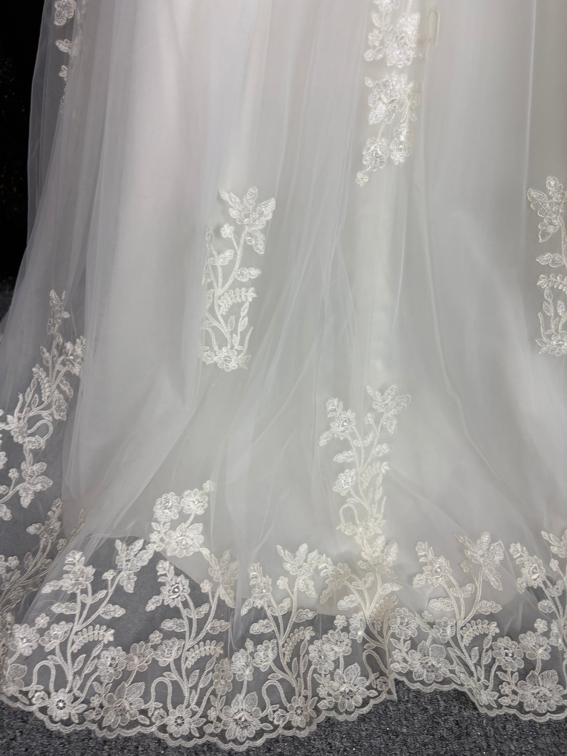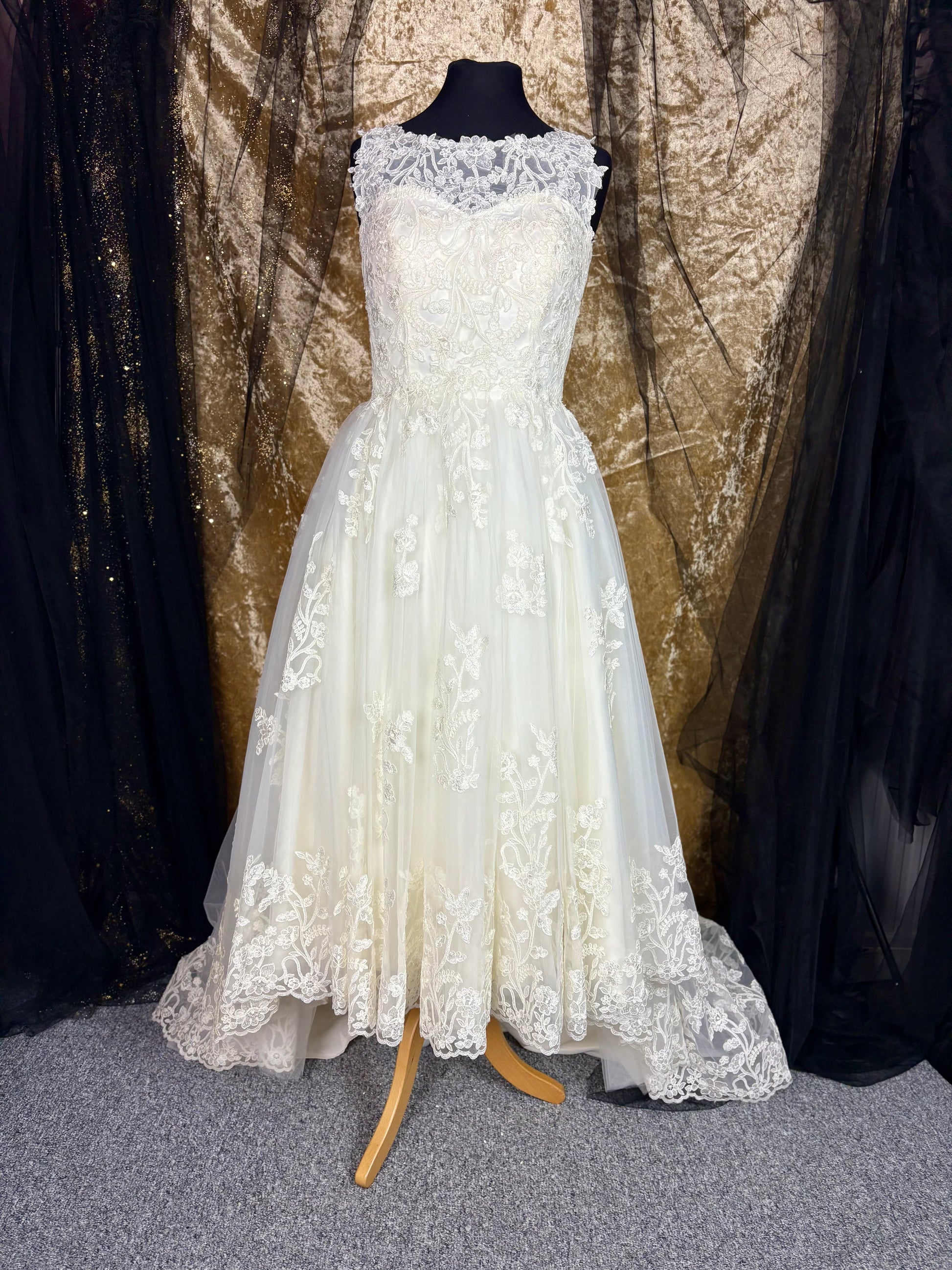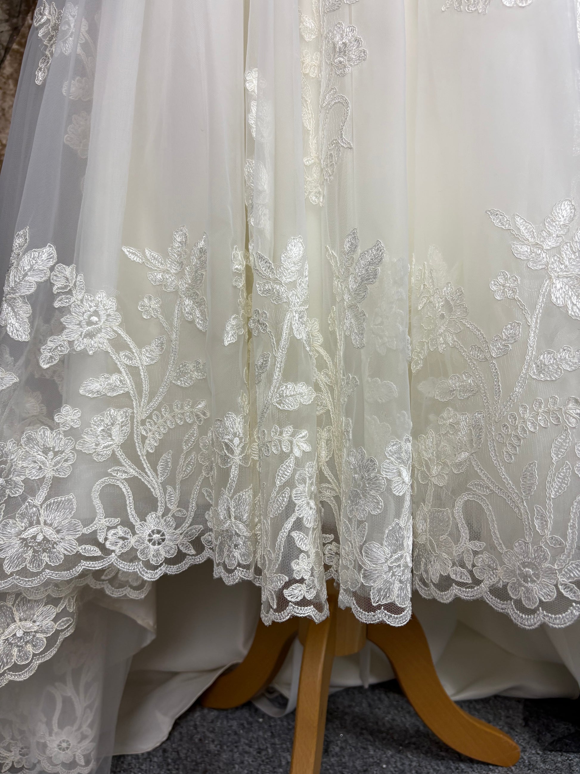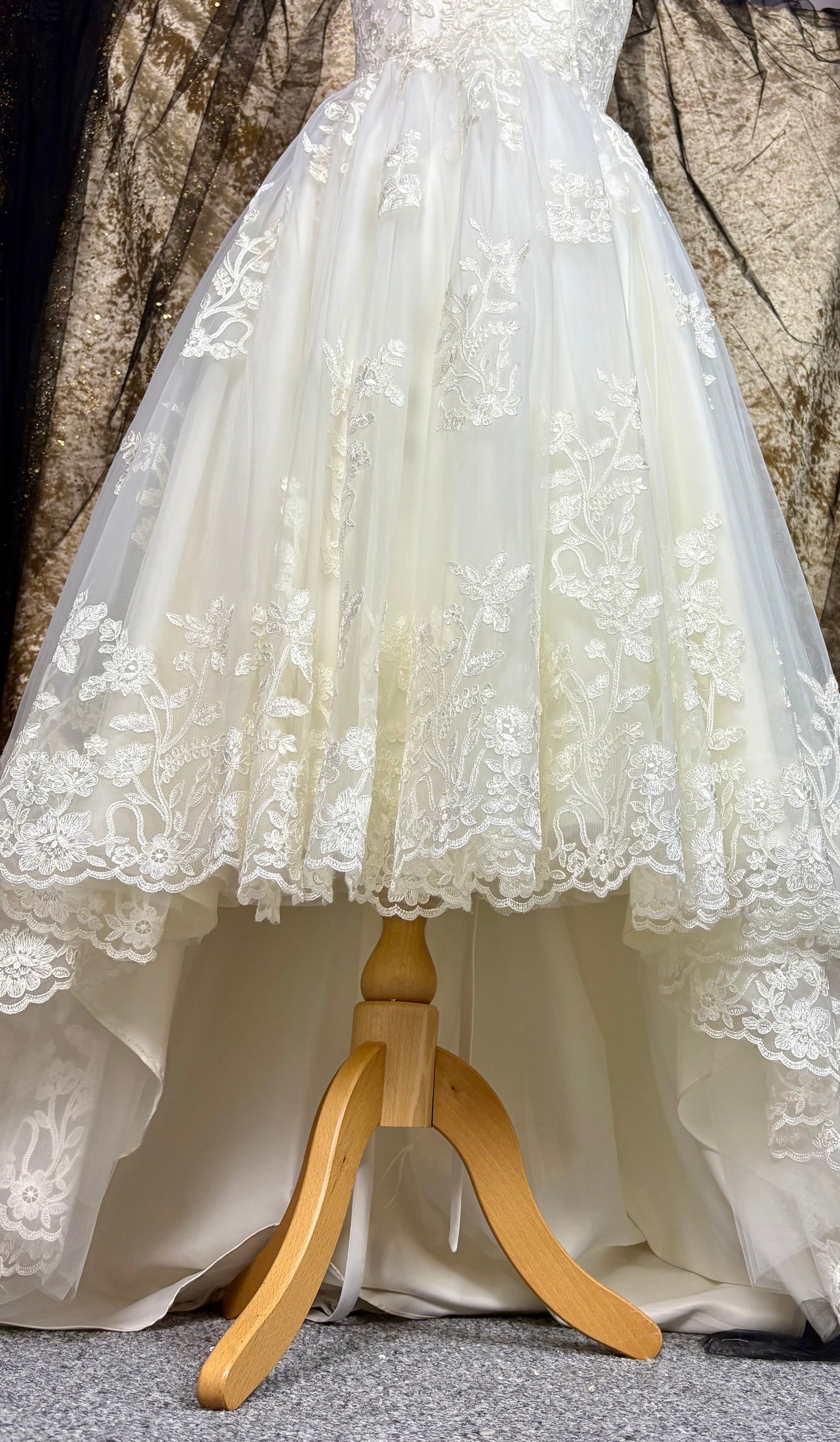 The hemline is beautifully finished with scalloped lace trim, adding a romantic and classic touch. The skirt has a gentle volume, offering movement and grace without the weight of a floor-length gown.