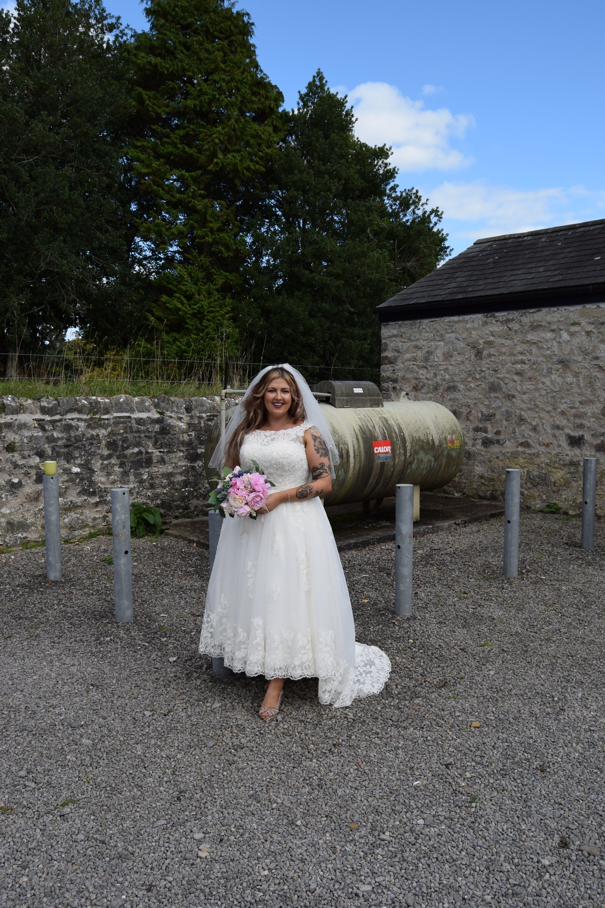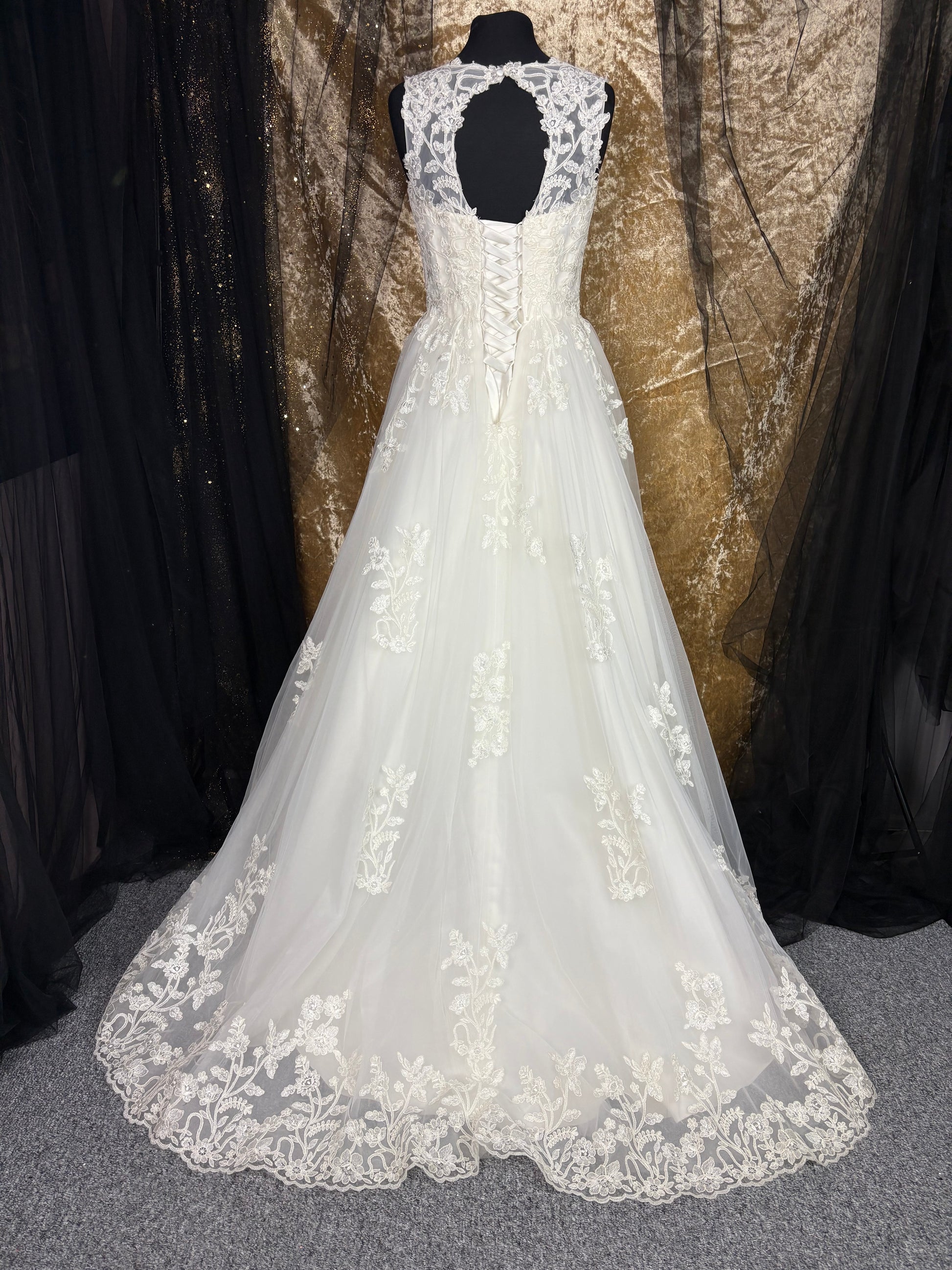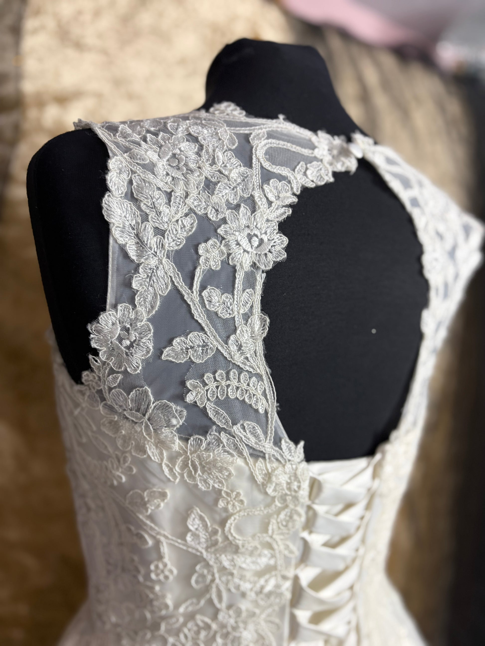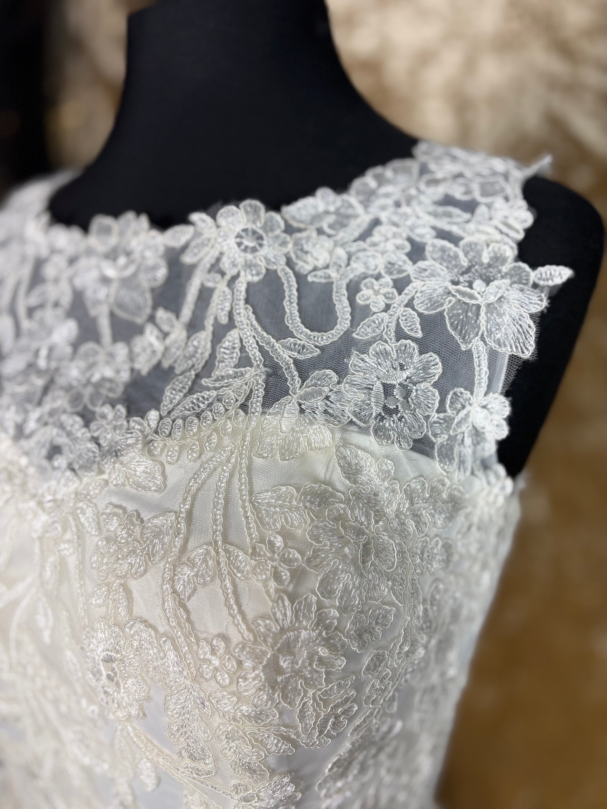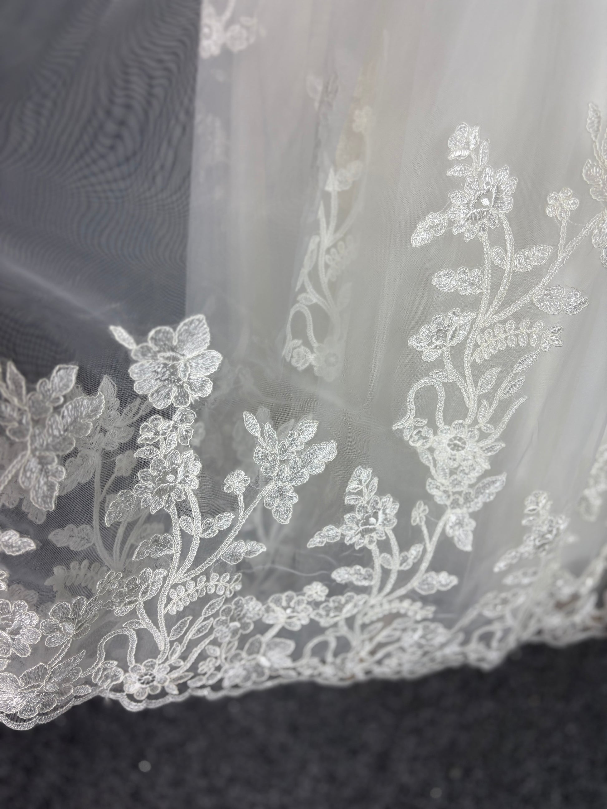 The hemline is beautifully finished with scalloped lace trim, adding a romantic and classic touch. The skirt has a gentle volume, offering movement and grace without the weight of a floor-length gown.
