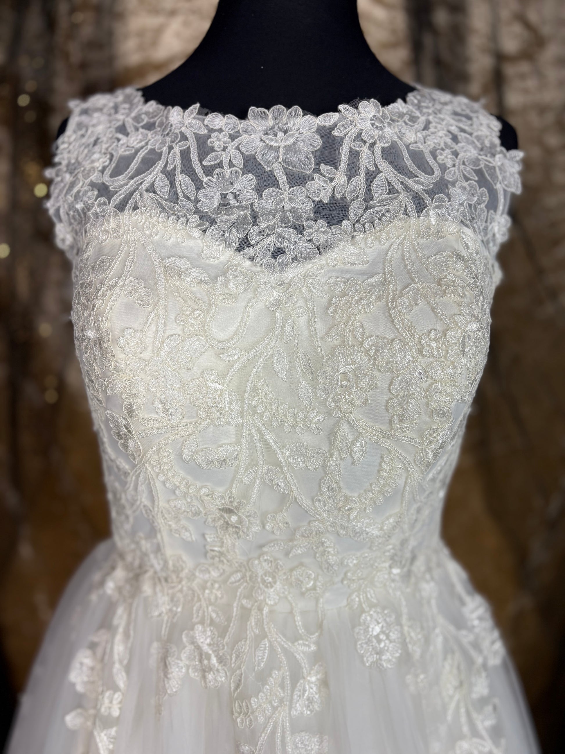 The Tea Party dress is a charming tea-length wedding gown with a vintage-inspired feel. The bodice features a high, bateau neckline with delicate lace overlay that extends over the shoulders, creating a soft and elegant frame. The waist is fitted, giving way to a full A-line skirt that falls to just above the ankles, allowing the shoes to be seen—a hallmark of tea-length designs.