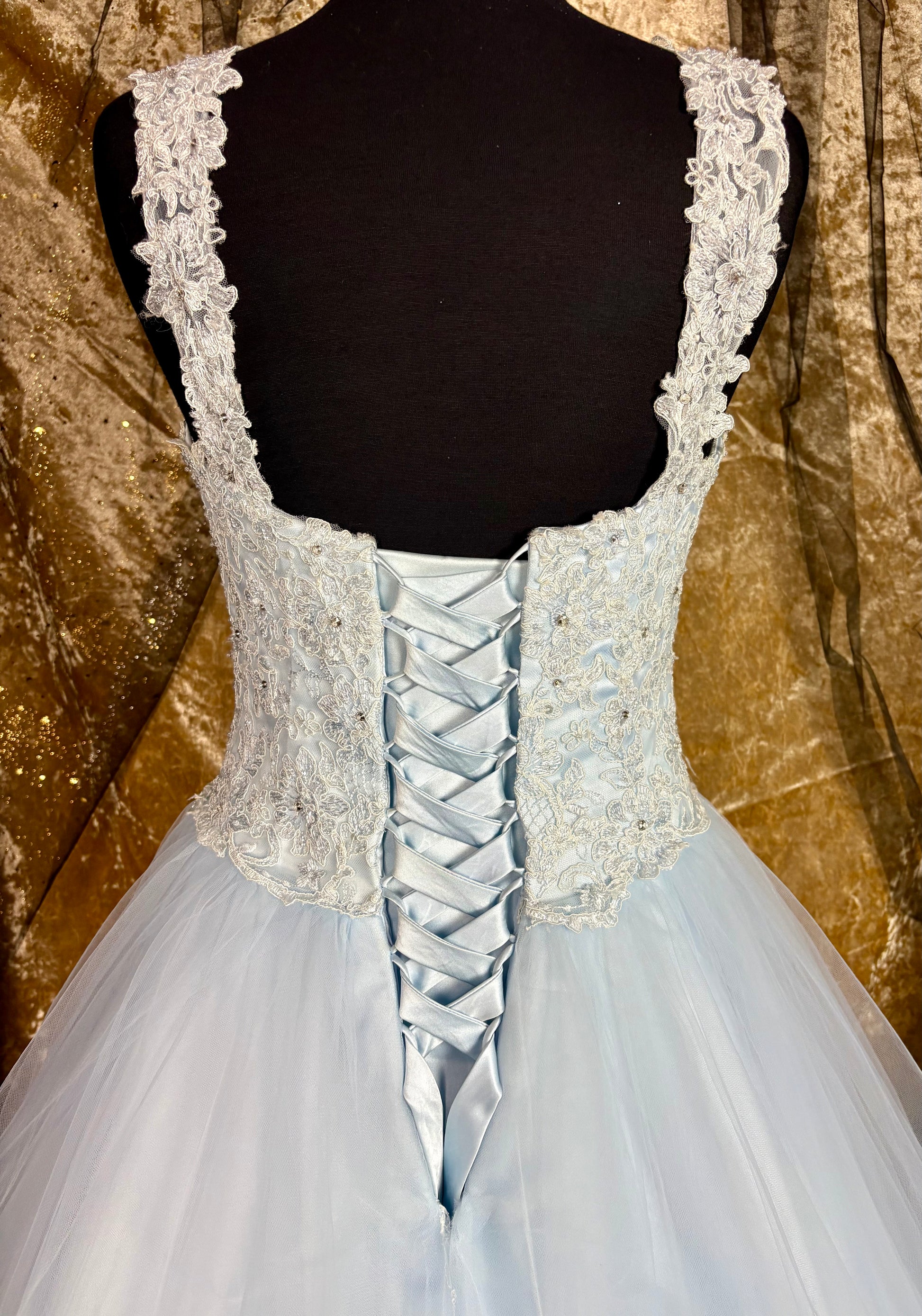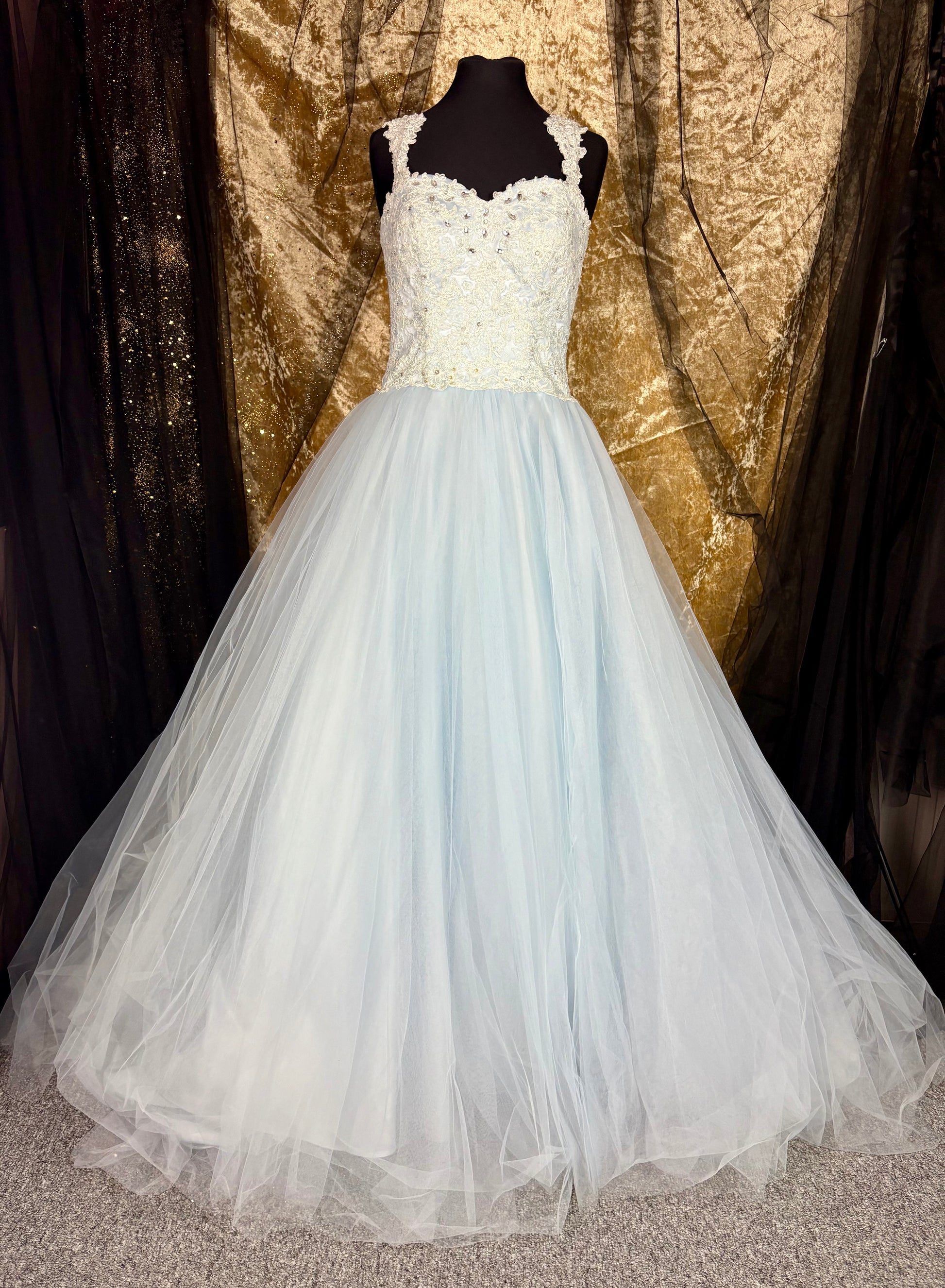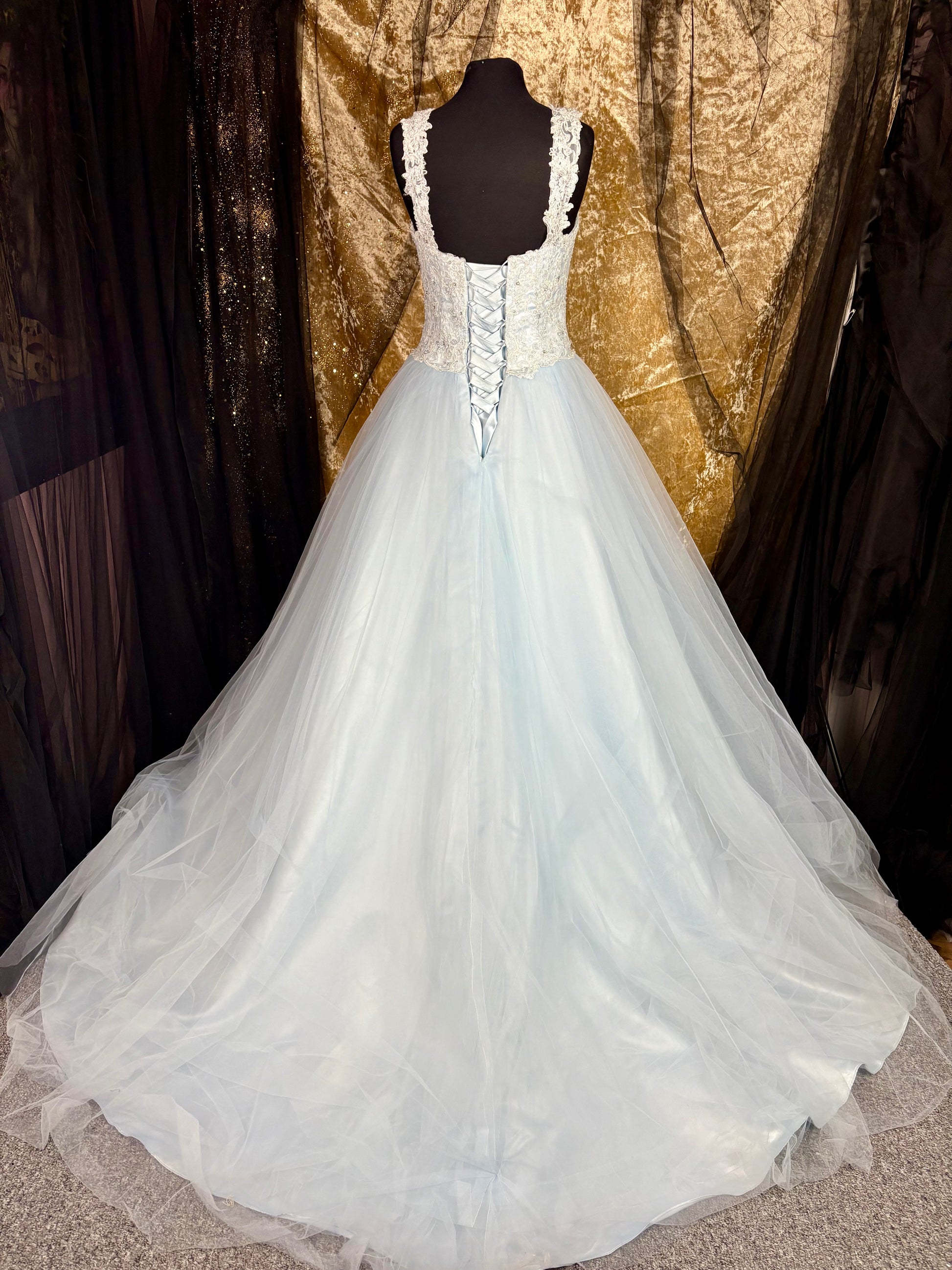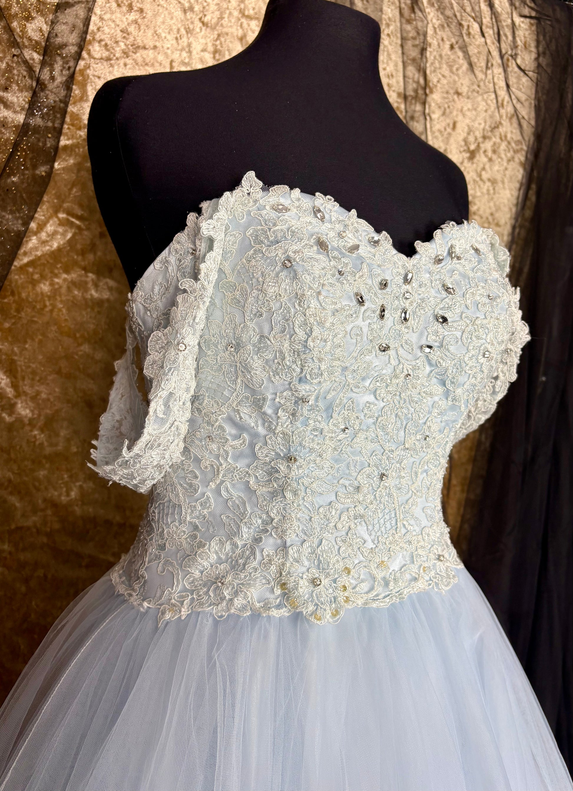 True Blue I Love You is a dreamy, fairytale-inspired gown. It features a sweetheart neckline with delicate off-the-shoulder lace straps, adding a romantic and feminine touch. The bodice is fitted and detailed, leading into a voluminous ball gown skirt made of layers of airy tulle, which gives it a cloud-like effect.