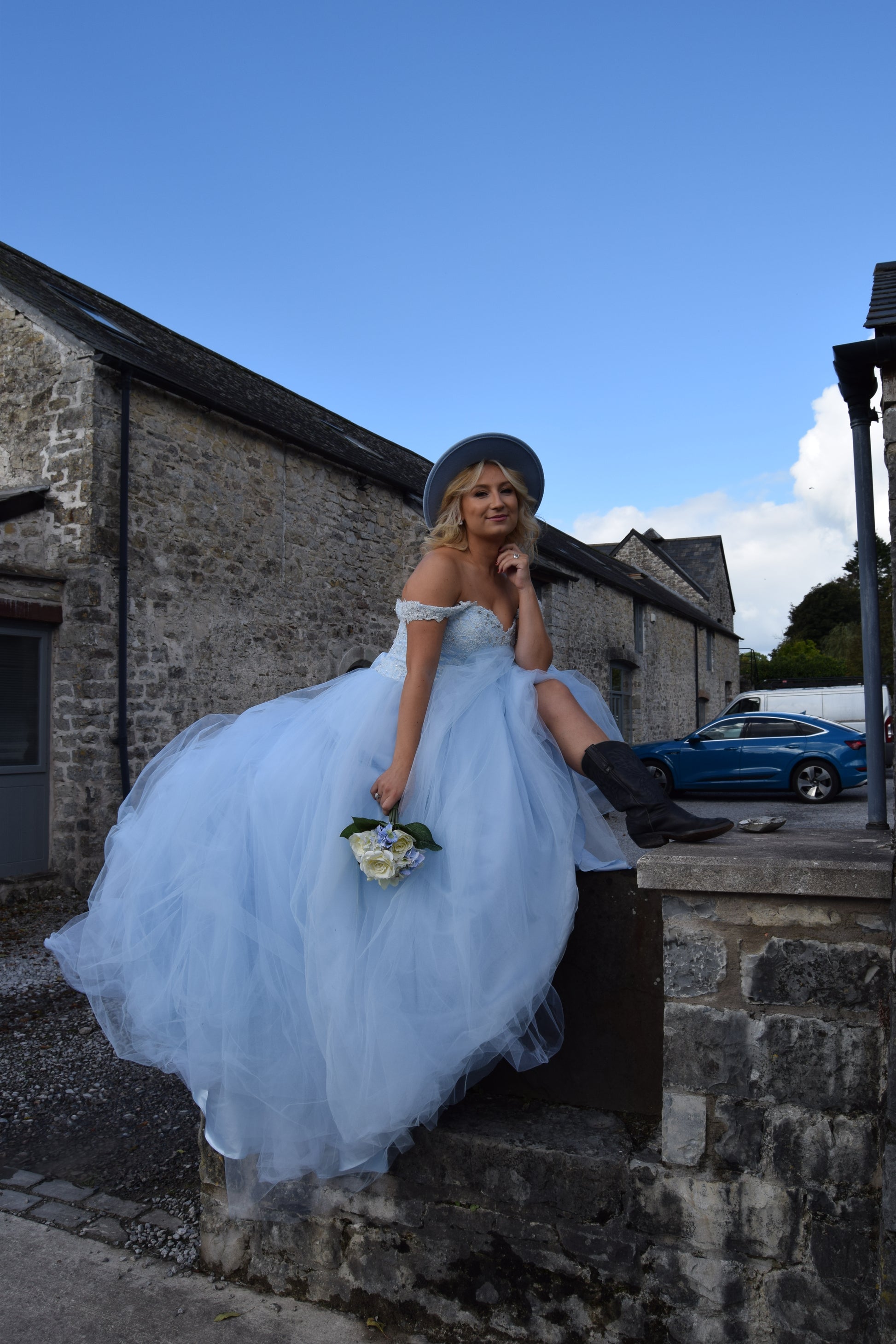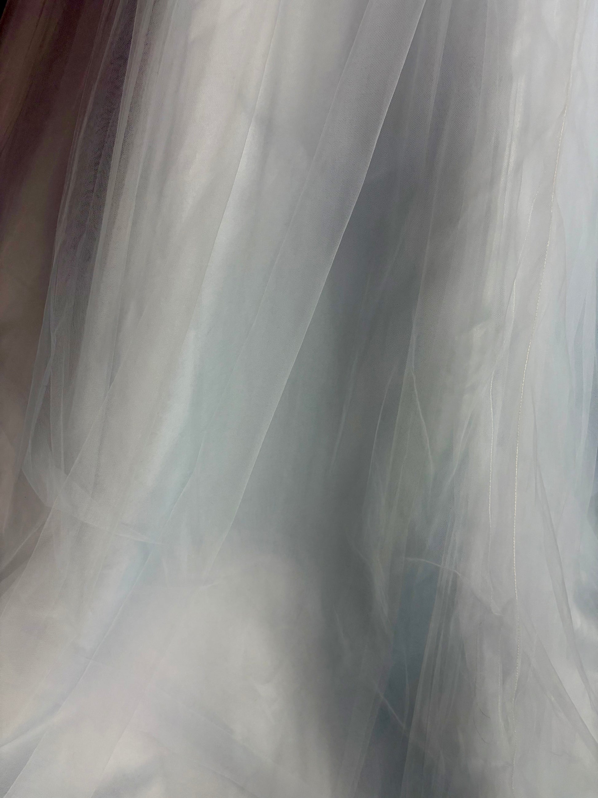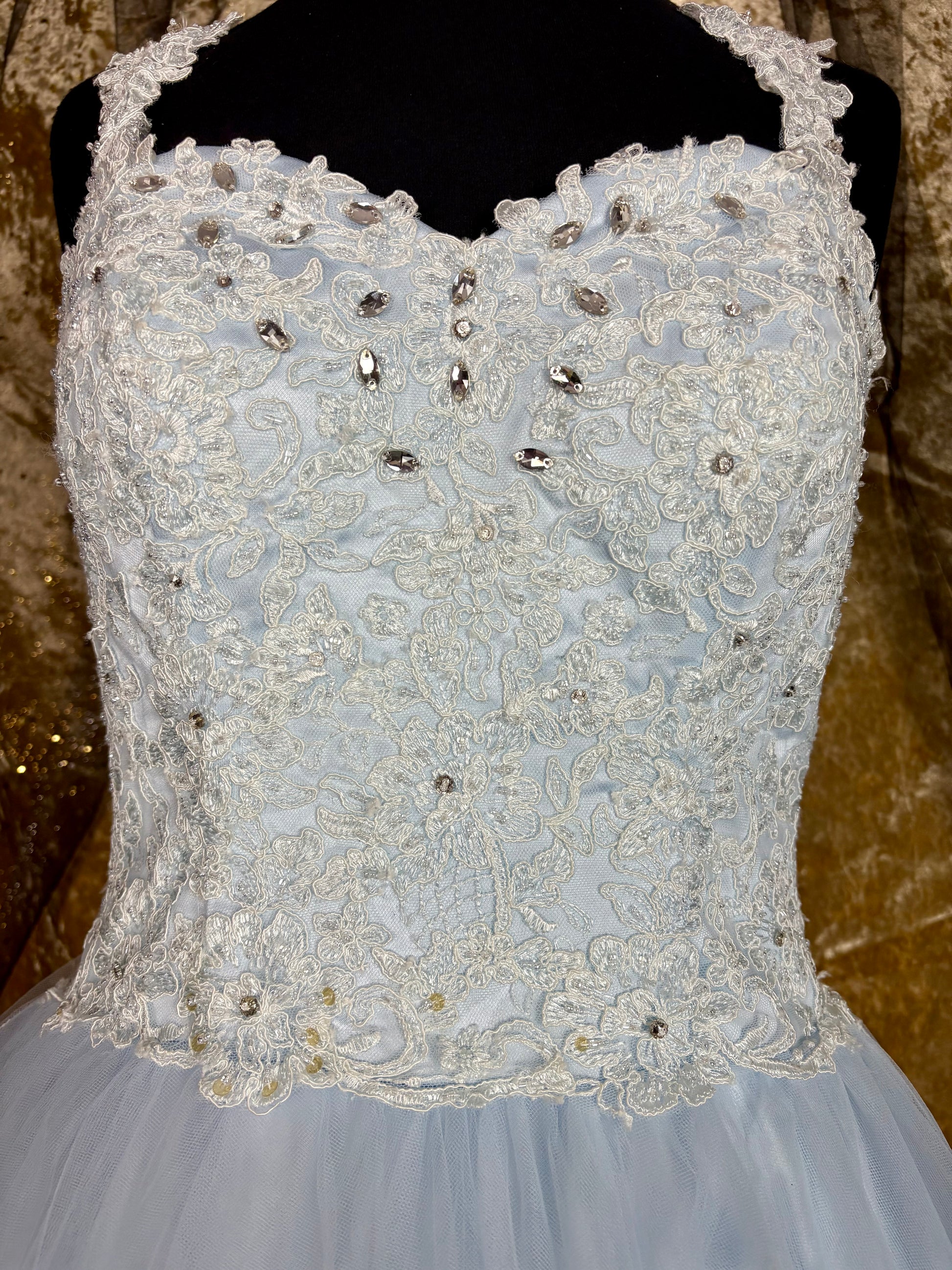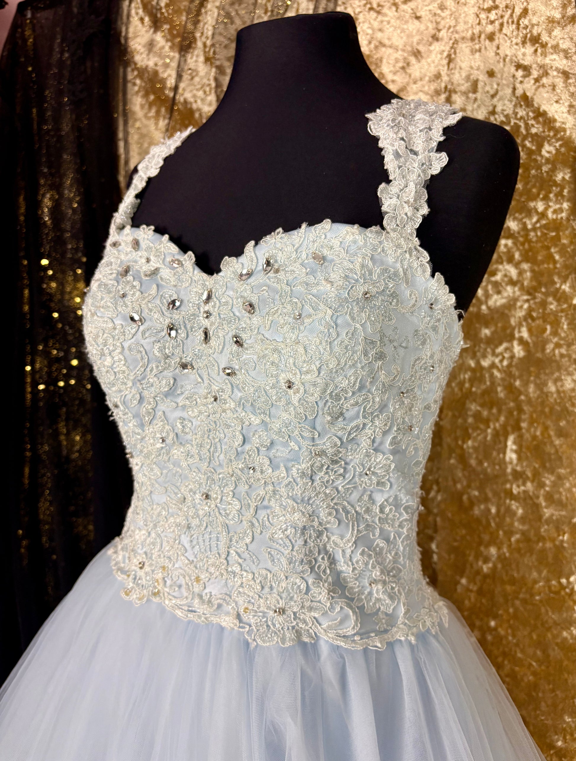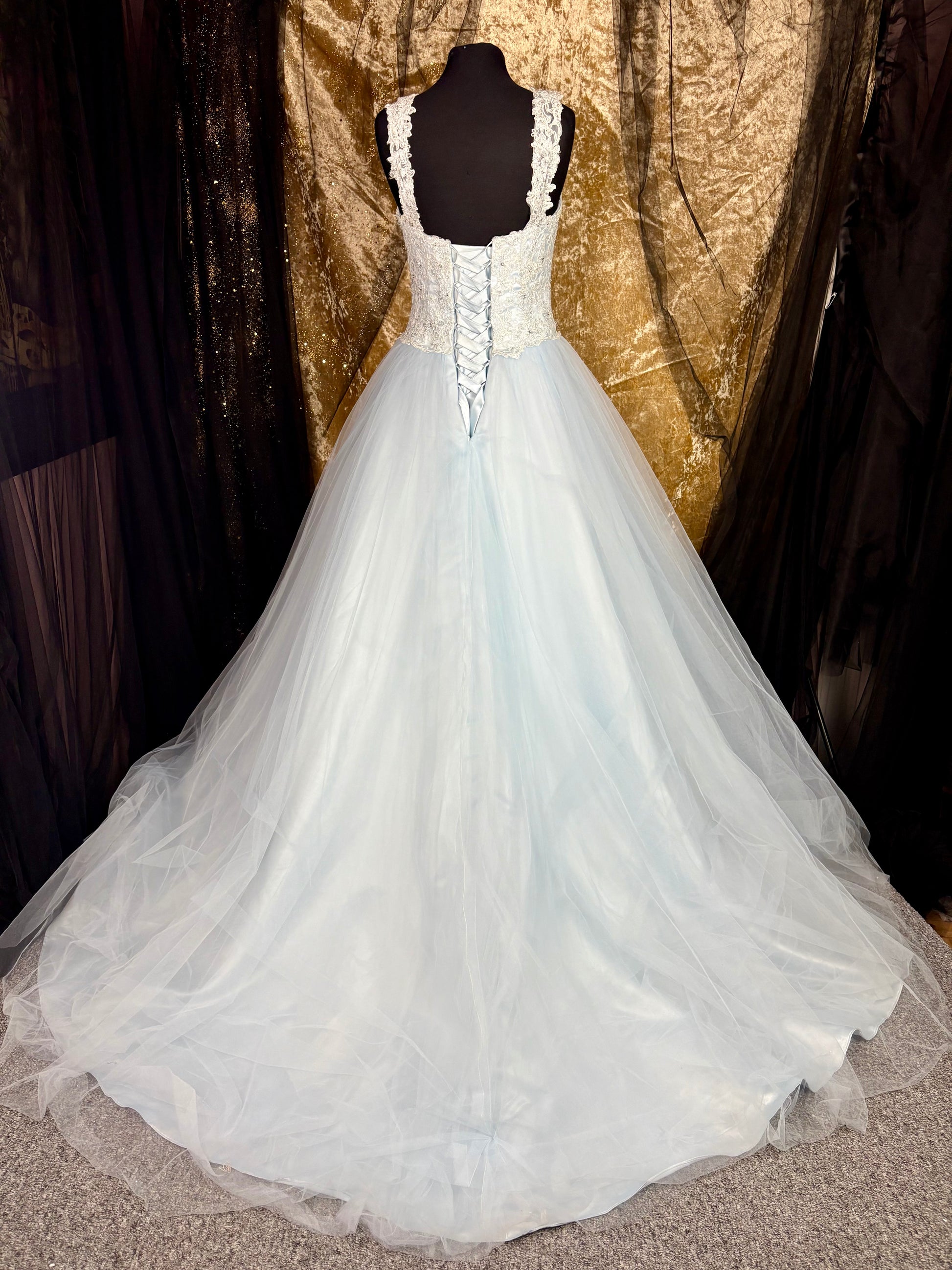True Blue I Love You is a dreamy, fairytale-inspired gown. It features a sweetheart neckline with delicate off-the-shoulder lace straps, adding a romantic and feminine touch. The bodice is fitted and detailed, leading into a voluminous ball gown skirt made of layers of airy tulle, which gives it a cloud-like effect.
