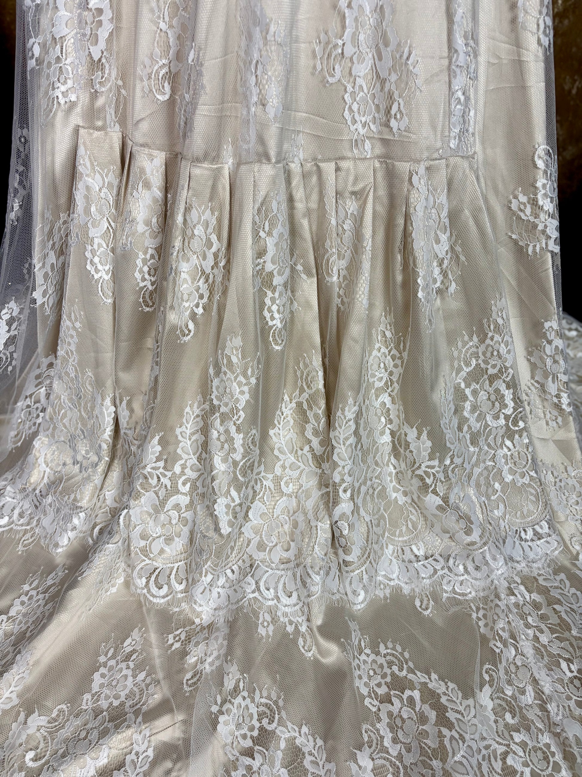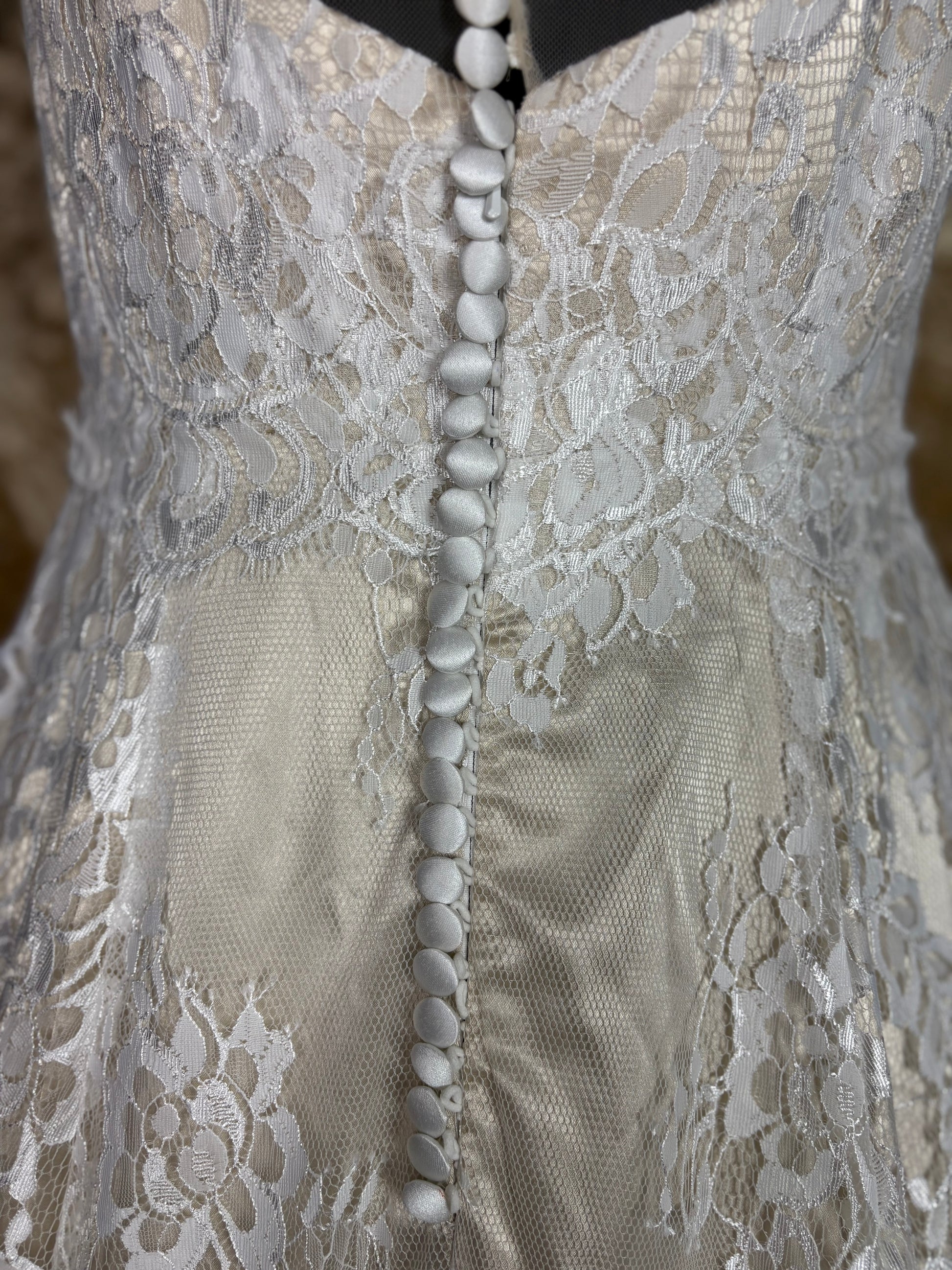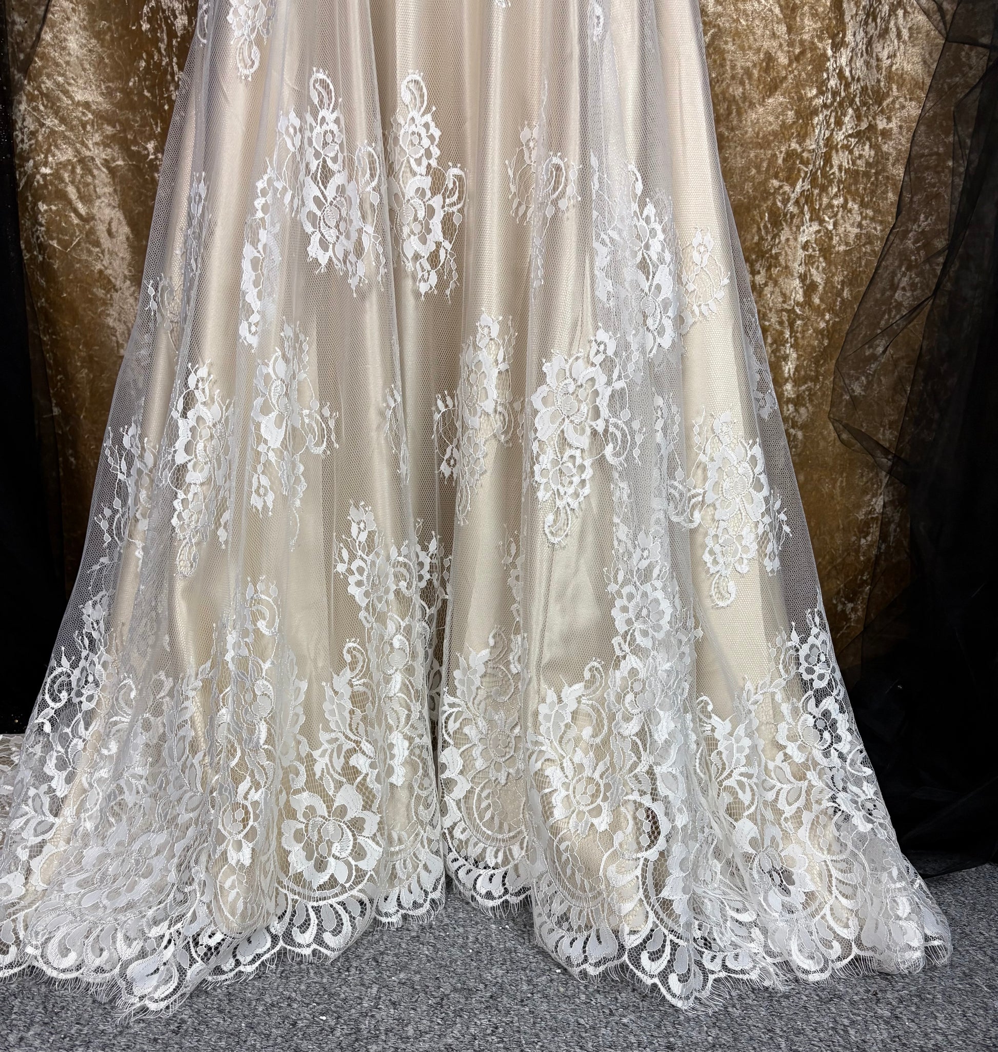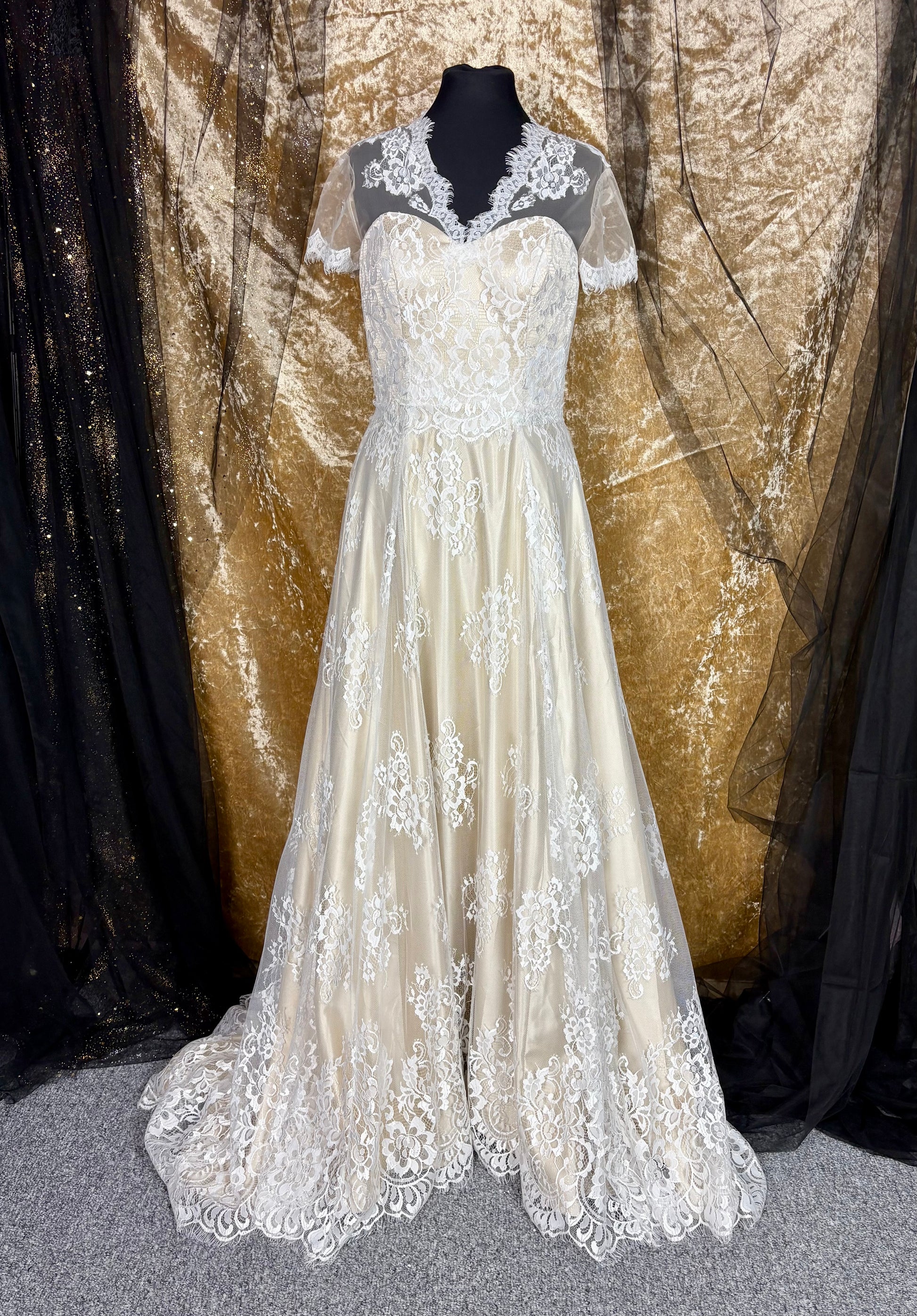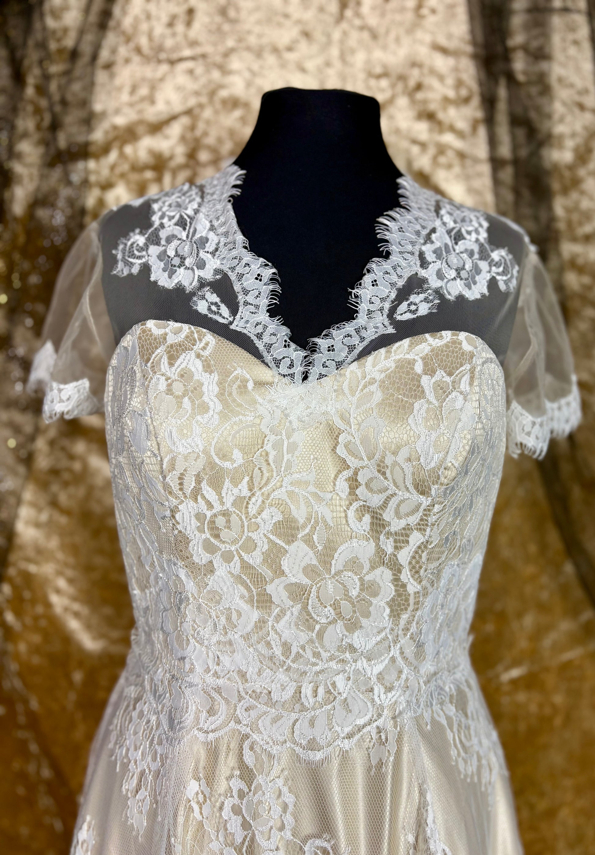The Wildly Vivacious Venetia dress is a glorious symphony of ivory lace and satin, a masterpiece that straddles the line between timeless romance and theatrical grandeur. Its bodice clings with sculpted precision, adorned in intricate lace that dances delicately across the shoulders and neckline like spun sugar. From there, the gown erupts into a sweeping cascade, a voluminous skirt that pours into an opulent train trailing behind like a whisper of regal majesty. Every layer is alive with texture—the lace overlay rippling with detail, the satin beneath gleaming with subtle allure—together creating a gown that feels less worn and more conjured, as if it were stitched from moonlight and old-world enchantment. This is not just a wedding dress; it is a declaration, a spectacle, a vision that commands every gaze and lingers in memory long after it passes.